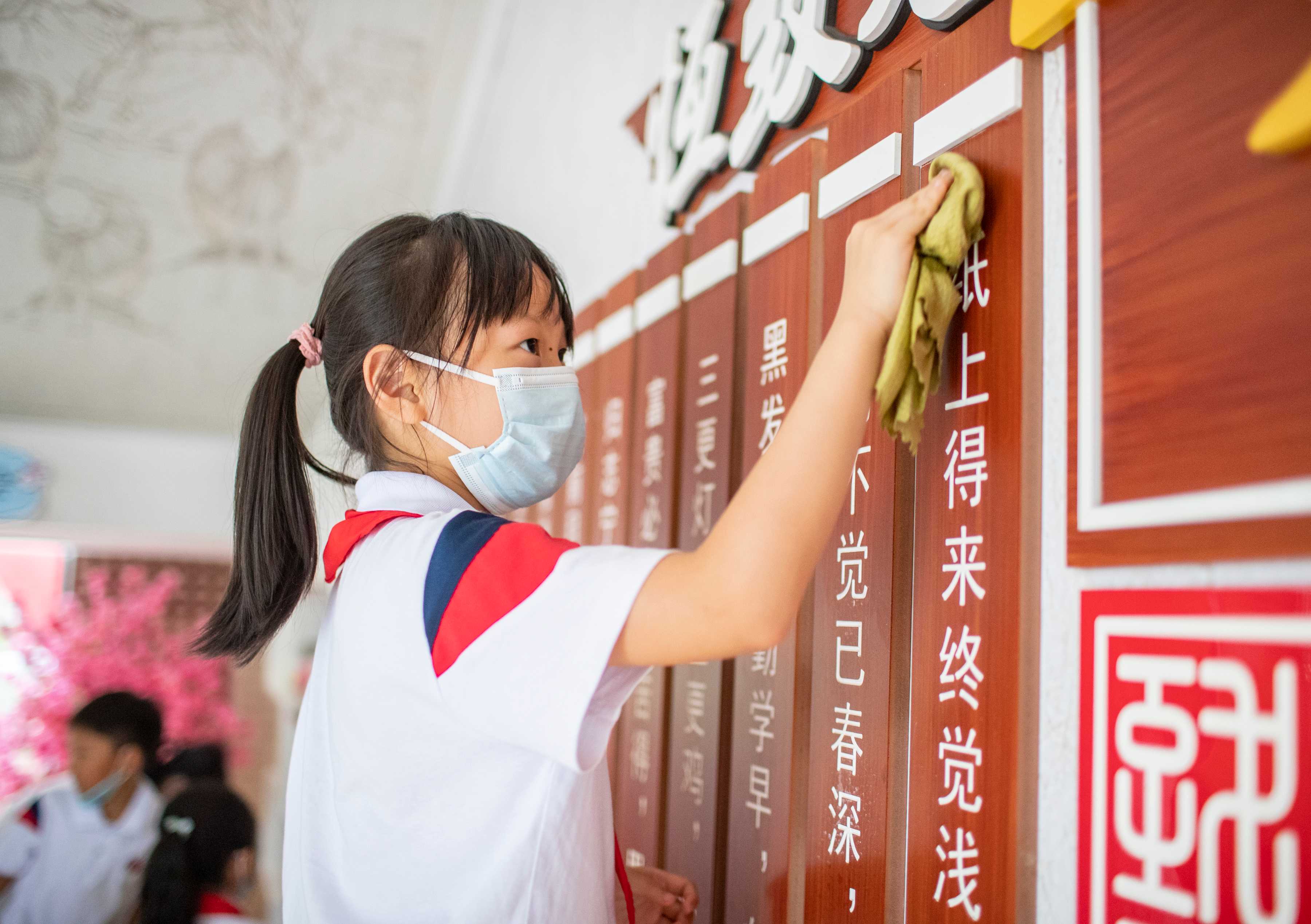 劳动课上 思含和同学们拿上抹布 到“包干区”绘本馆里清洁桌椅、书本 在开发区二小 校园里挂满了同学们平时做的美术手工艺品 德育评价与劳动、文明挂钩 学生作业也有科学探究、体育锻炼 艺术欣赏、社会与劳动实践等不同类型