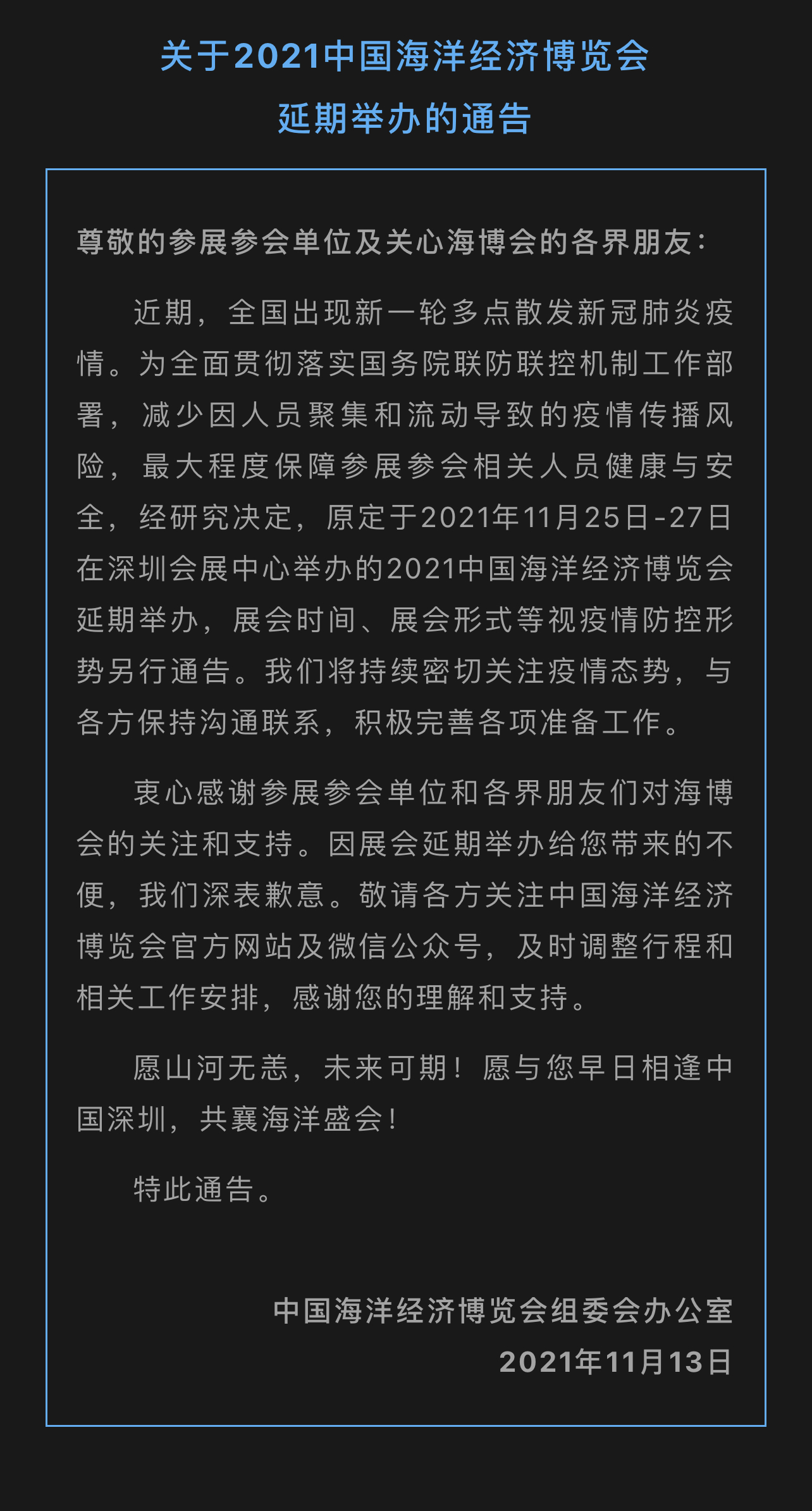 近期,全国出现新一轮多点散发新冠肺炎疫情。为全面贯彻落实国务院联防联控机制工作部署,减少因人员聚集和流动导致的疫情传播风险,最大程度保障参展参会相关人员健康与安全,经研究决定,原定于2021年11月25日-27日在深圳会展中心举办的2021中国海洋经济博览会延期举办,展会时间、展会形式等视疫情防控形势另行通告。我们将持续密切关注疫情态势,与各方保持沟通联系,积极完善各项准备工作。