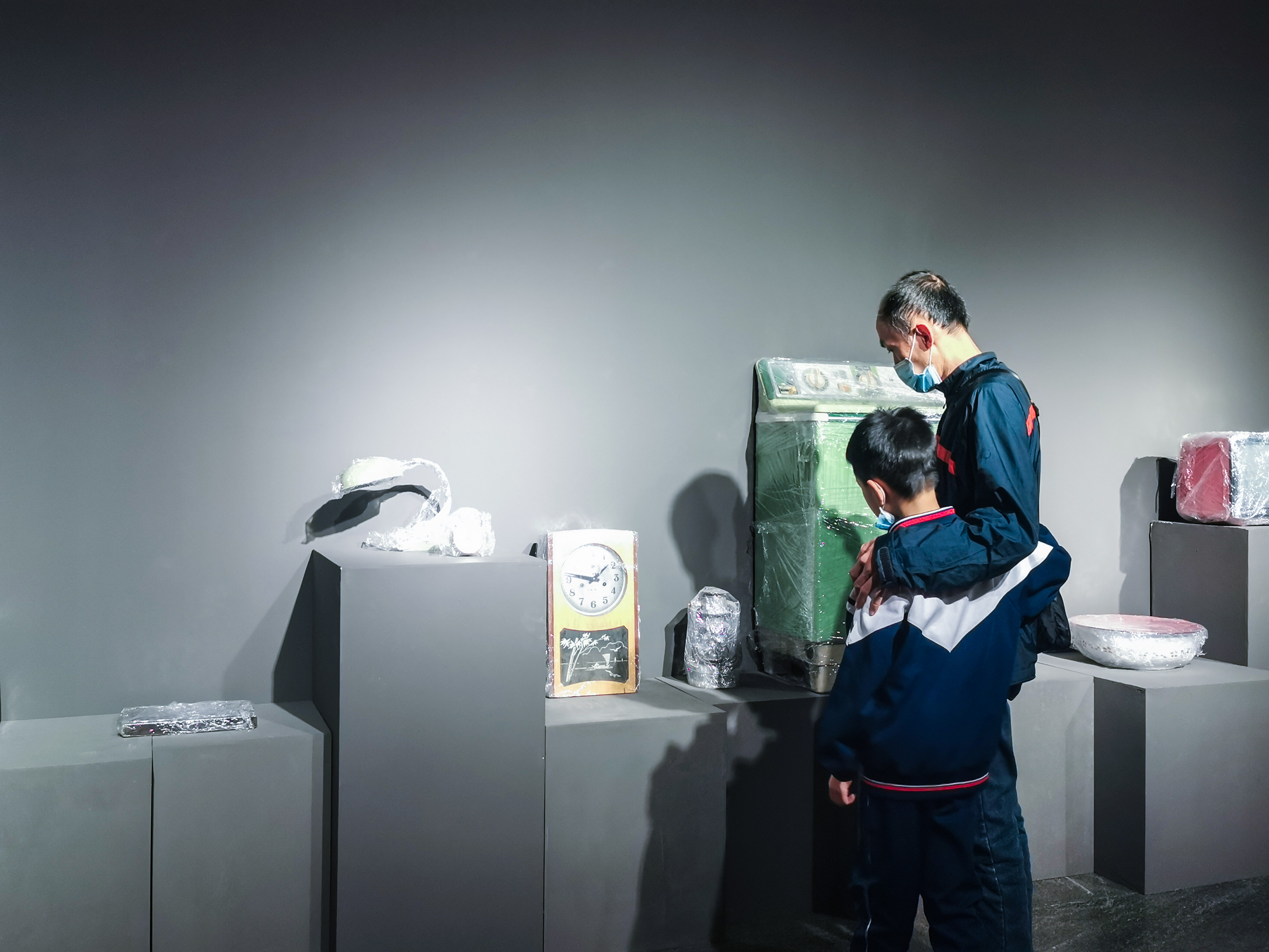 除了影片,李纲在展厅中搭建了一个昏暗的霓虹灯环境,展示一些被保鲜膜缠裹的老物品,建构一个植根于集体记忆的“博物馆”。上世界90年代的风扇、电视机、洗衣机、电影杂志等出现在了展览现场,李纲说,“这些老旧的寻常物件,具备历史属性之余,在我‘考古’过去某一个时段生活状态的过程中,亦观照了我自身的记忆、态度和思考。”