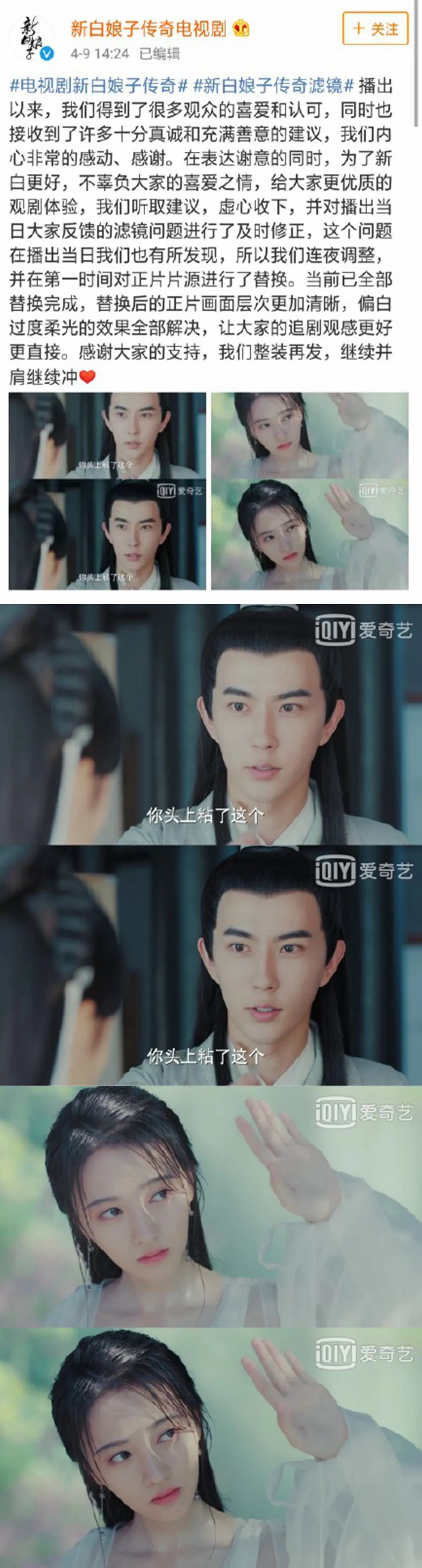 类似由滤镜惹出的笑话还有不少。之前《新白娘子传奇》播出时,不少网友都反映滤镜开得太强,人的五官都快看不清,连法海的抬头纹都磨没了。导致该剧剧方紧急换滤镜,对偏白过度柔光进行调整。作为主角的于朦胧还发文,表示“许仙的十级美颜滤镜正式下线,‘于清晰’同步上线”。