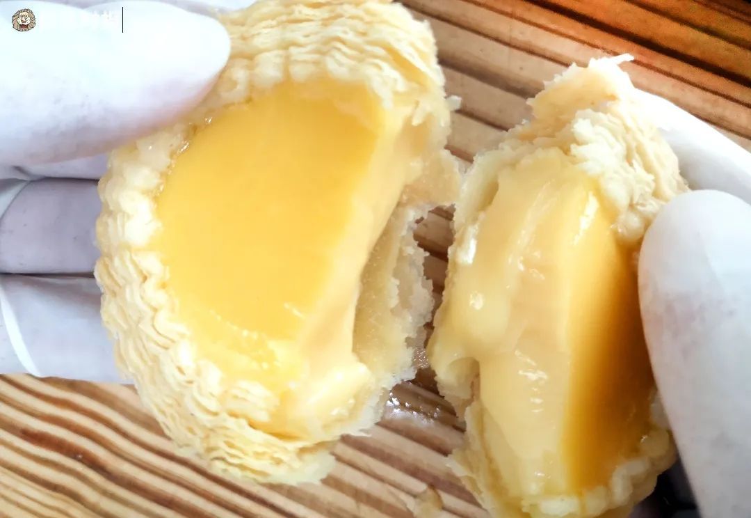 早年间,大同的蛋挞皮做的是拿酥皮,口感似曲奇饼,偏扎实。“现在,我们会根据季节、气候灵活地调整低筋面粉与中筋面粉的比例,分别搭配猪油、水制作成‘水油皮’,这种皮口感酥化,层次分明。”