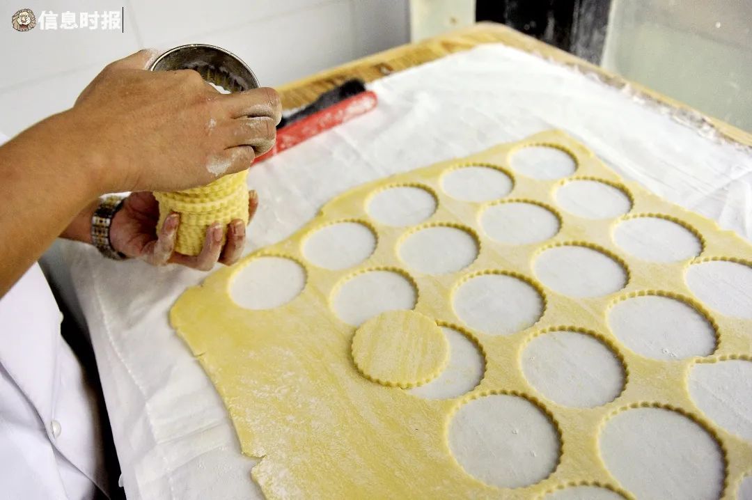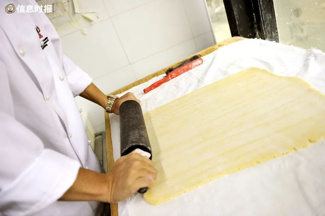 为了更好地感知面粉的筋度和湿度,陈英杰强调,开酥必须由人手制作,经过“三三四”这一繁复的折叠过程,还得冷冻、擀薄,方能入模成型。