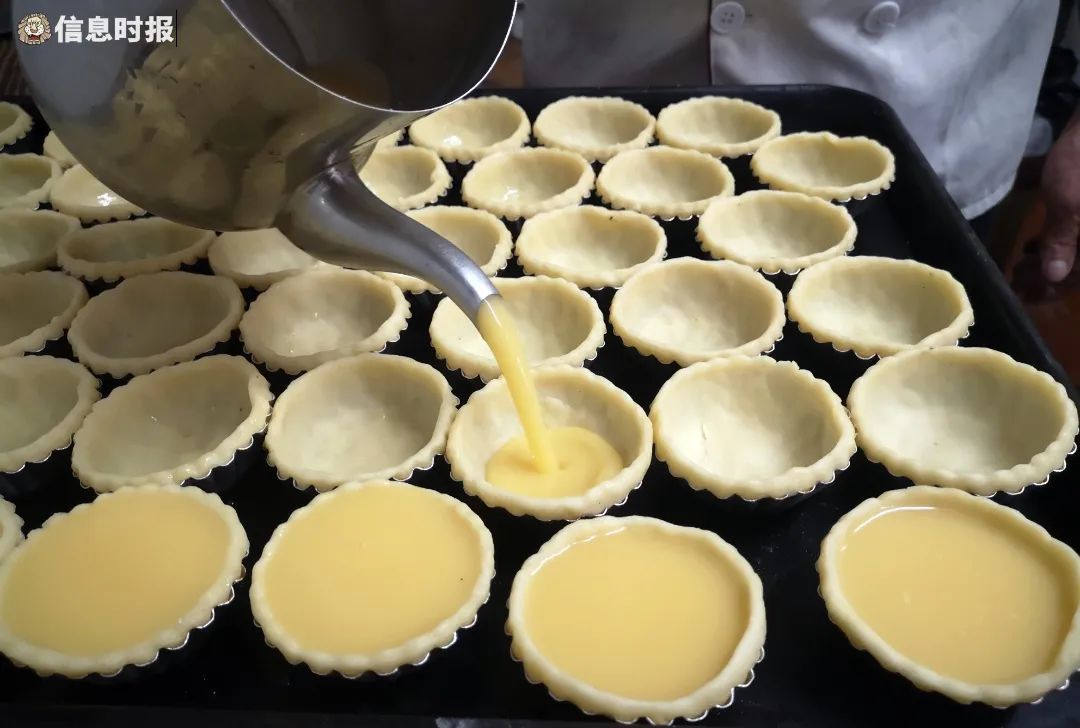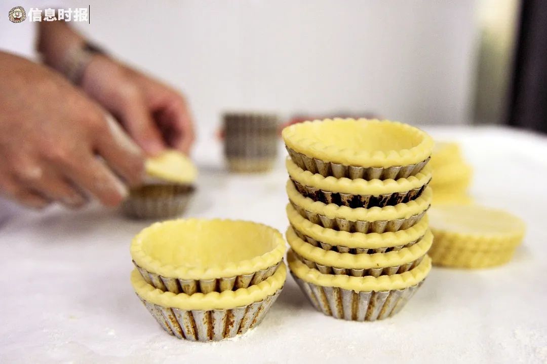 别看蛋挞小小一盏,能否将它做好,每一步制作环节都非常关键。陈英杰表示,蛋挞由蛋挞皮和蛋水两部分组成。