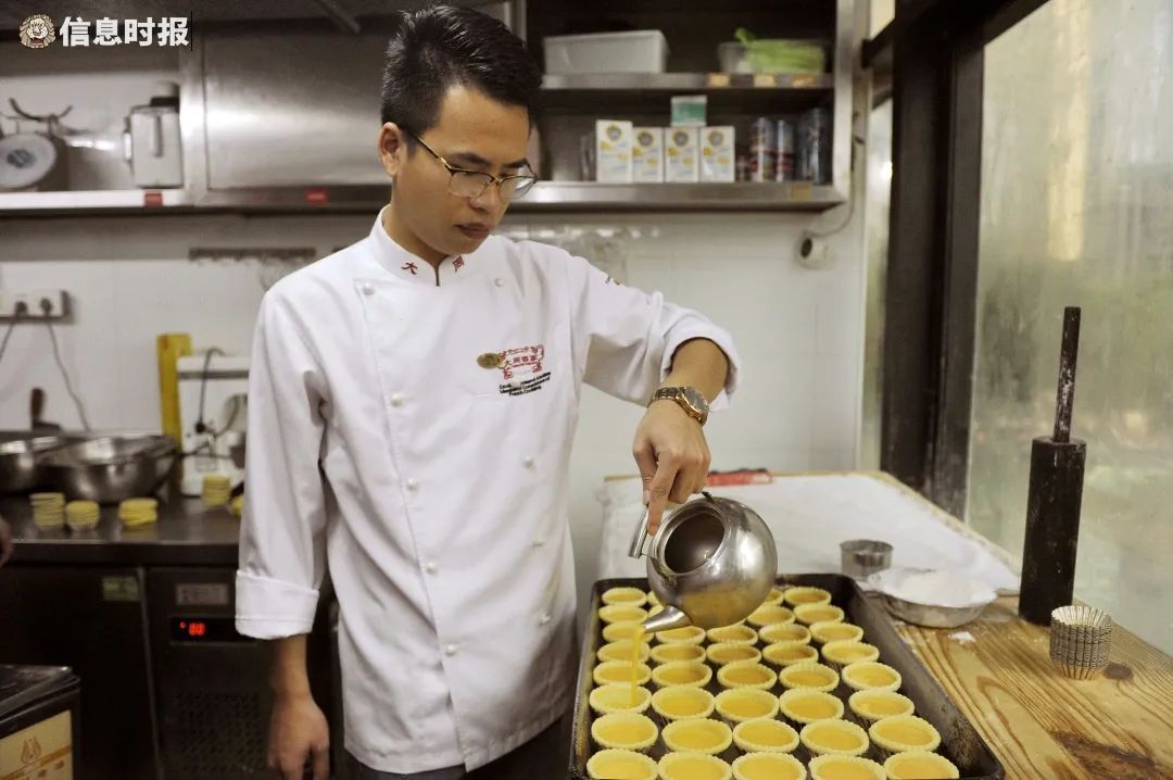 蛋水制作的关键,则在于水和糖的比例。“若糖太少,蛋水可能会出现裂纹;若糖太多,则会过甜过腬(音‘漏’)。”一件完美的蛋挞,蛋水是否越饱满越好呢?陈英杰并不如此认为,“蛋水只需7分满就足够。”能让食客吃得意犹未尽,大概便是蛋挞师傅的高明之处。