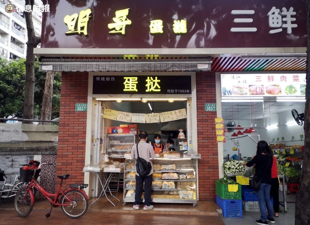 明哥蛋挞是工业大道中上再普通不过的一家街边小店。与店主明哥甫一见面,其洪亮的嗓门和健谈便给记者留下了鲜明的印象。这家小店铺面虽小但五脏俱全,门前陈列着葱油包、香蕉糕、蛋散、煎堆等十几种广式点心,后厨直通生活间,烟火气十足。明哥阳光和蔼、老板娘亲切好客,加上两位店主一口醇正的粤语,这间街坊小店透出来的,是地道的老广气质。