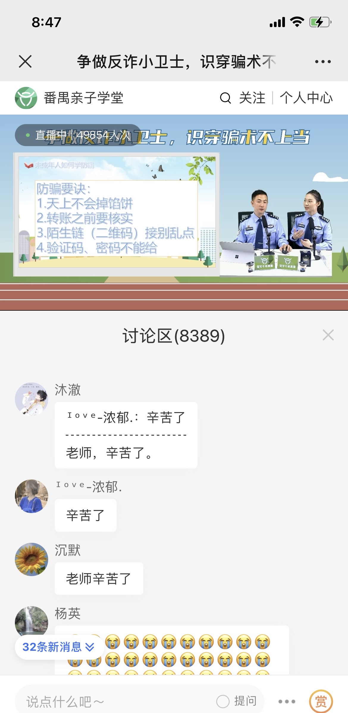 警官们通过典型案例分析、生动有趣的反诈动画片、校园反诈街访视频,让学生、家长们更深入地了解校园电信诈骗的特点、种类、预防与处置。在直播过程中,学生、家长们也纷纷发表评论表示,通过这一堂生动有趣的反诈直播课,增强了自我防骗意识和拓展了反诈知识。
