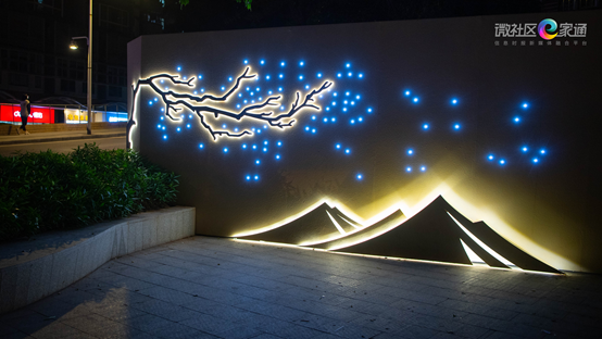 由于广场上的背景墙装有灯带及灯点,每至天黑灯亮时,广场美不胜收。