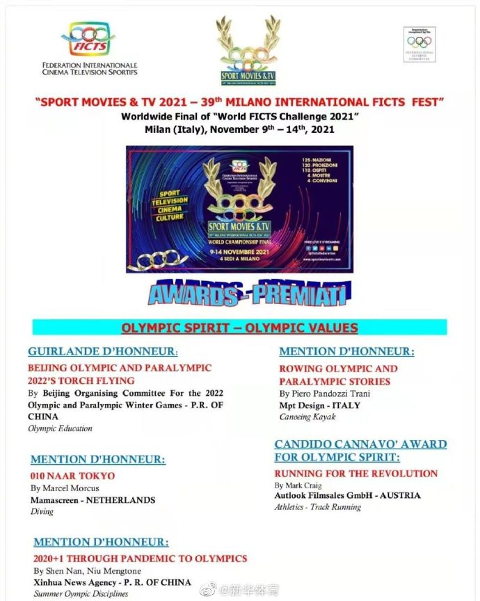 在稍早进行的第17届北京国际体育电影周上,共选出了13部作品参与今年米兰国际体育电影电视节全球总决赛。最终,在最受瞩目的“奥林匹克精神与价值”竞赛单元中,北京冬奥组委出品的短视频《北京冬奥会和冬残奥会火炬宣传片》获得金花环奖。由新华社出品的东京奥运会纪录片《追光:东京之路》与来自荷兰、意大利的另两部作品获得该单元的提名奖。