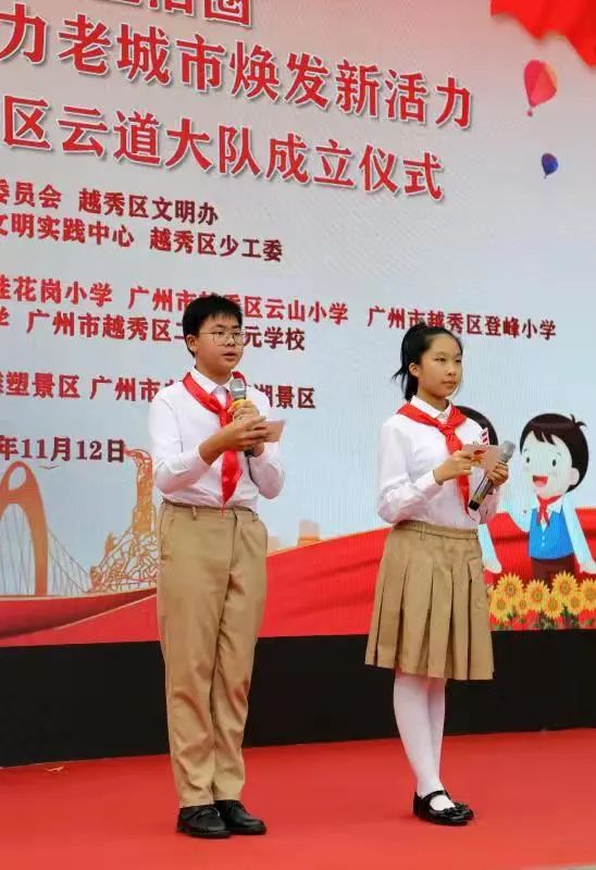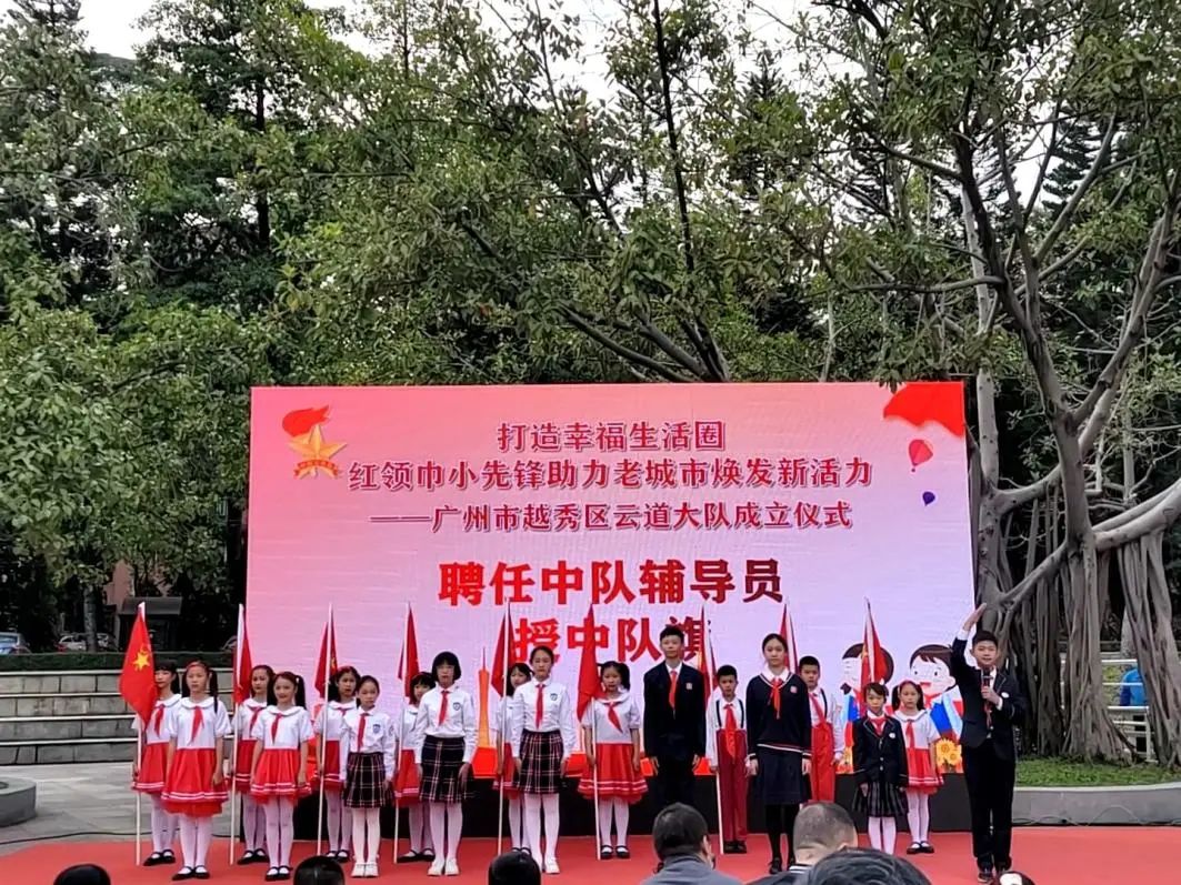 为拓展校外少先队组织,加强组织和工作覆盖、不断扩大渠道,11月12日,由共青团广州市委员会、越秀区文明办、越秀区少工委指导开展的2021年“少先队广州市越秀区云道大队”成立仪式在广州雕塑公园进行。广州市越秀区桂花岗小学、云山小学、登峰小学、二中、二中应元学校,以云道为纽带共同组建校外少先队组织(以下简称“云道大队”),这也是广州市首个在风景区内成立的少先队组织。