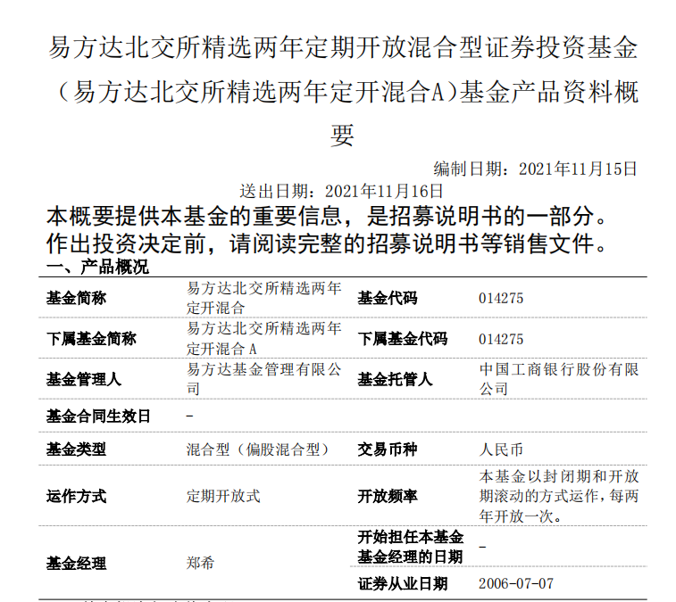 11月15日,北交所正式开门迎客。当日盘后,易方达基金公告称,旗下北交所精选两年定期开放混合型证券投资基金将于11月19日起发行。公告显示,该基金将自2021年11月19日至2021年11月25日通过基金管理人指定的销售机构公开发售,首次募集规模上限为5亿元人民币。