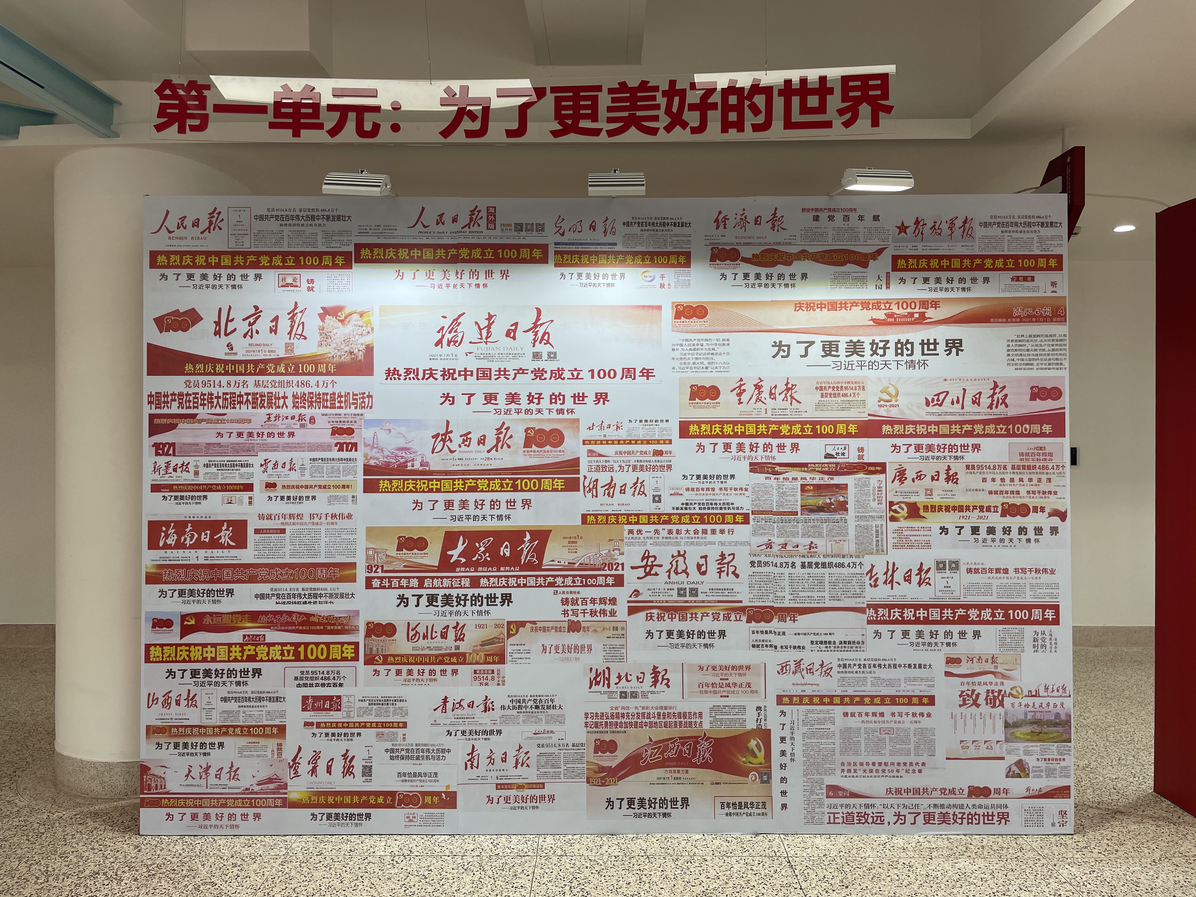 2021年11月15日,记者在现场看到,展览分为三部分,第一单元集聚式展出中央、省级党报7月1日的头条版面《为了更美好的世界》,标题及风格的统一给人以视觉震撼,报道当天的时势风向一览无余,极具历史参考价值。