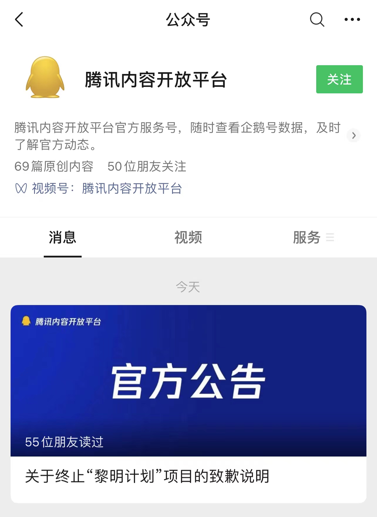 11月17日,腾讯内容开放平台公众号发布“关于终止‘黎明计划’项目的致歉说明”。说明表示,“黎明计划”的初衷是,在得到创作者的授权前提下,鼓励MCN机构邀请创作者入驻并帮助创作者运营,让创作者在腾讯各内容平台获得收益。但由于该计划在执行过程中管理不严,加上该计划在部分产品设计上也不完善,导致了不少问题,现决定终止“黎明计划”项目。