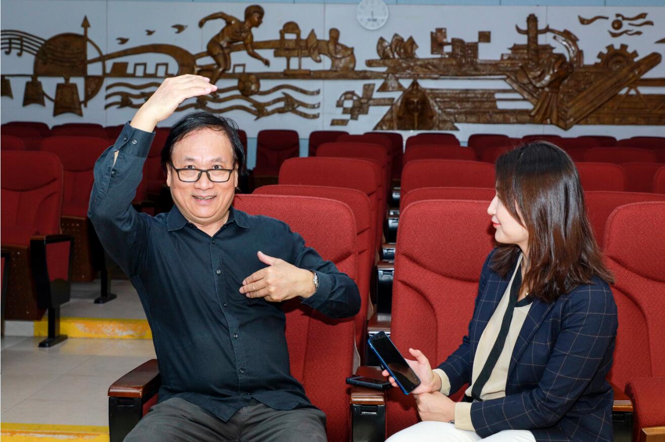 李建新(左)接受本报记者采访。古老皮影推陈出新 尊重传统巧妙融合
