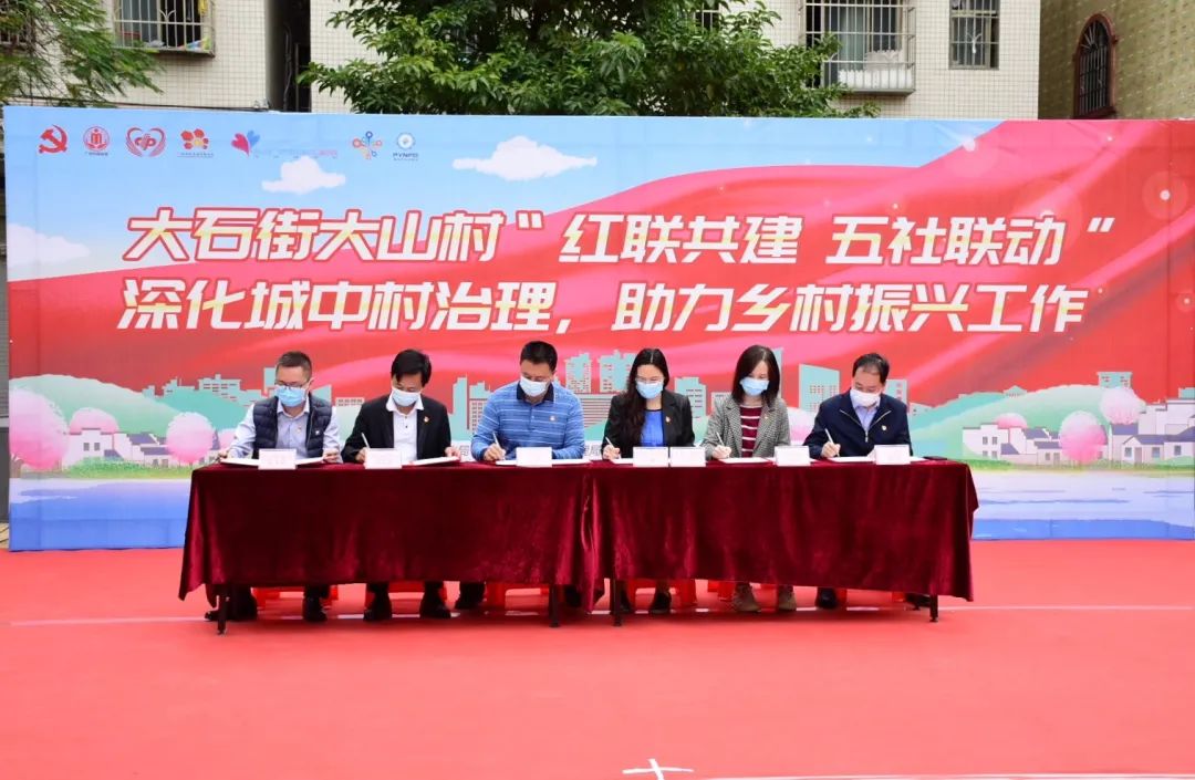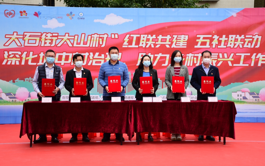 活动现场,大石街大山村党总支与区慈善会党支部,区社会组织妇联、工会联合会,区社联会党支部,大石街商会党支部、广州市天河区启智社会工作服务中心党支部等签订“红联共建”党群结对共建承诺书。