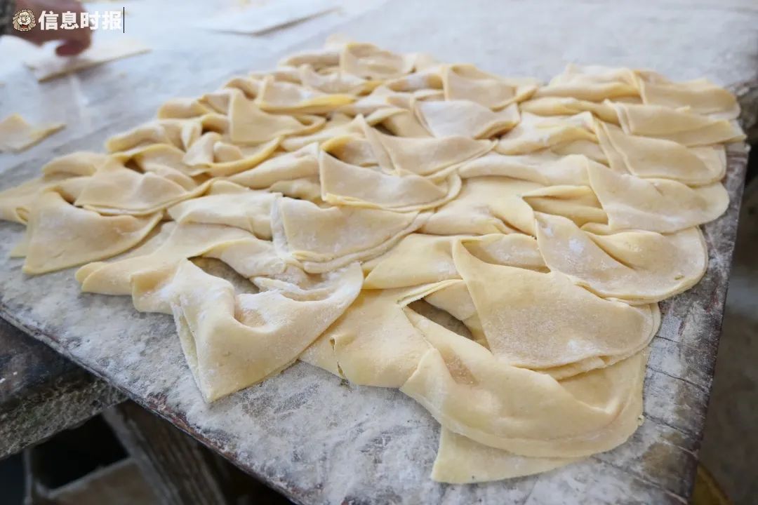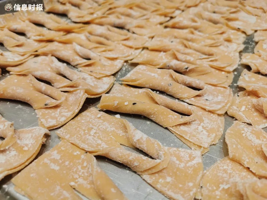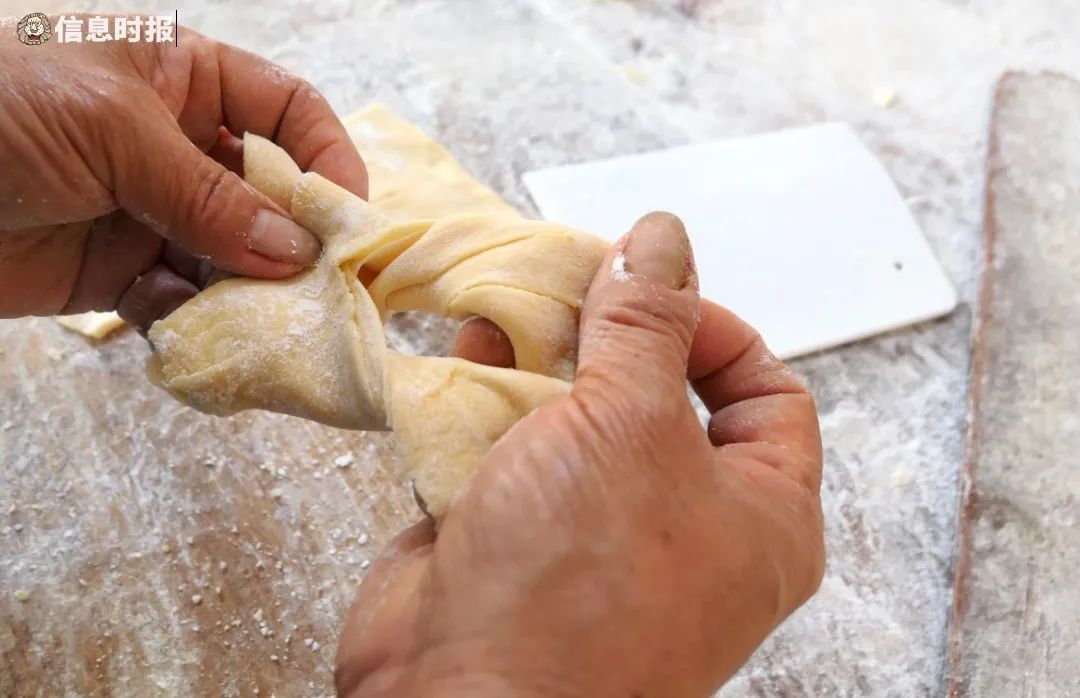 两块长方形面皮叠在一起,中间划开一刀,将面皮一端从划口中穿过,轻轻一拉一抻,就能结成小巧的蝴蝶结。信息时报记者 徐敏 摄
