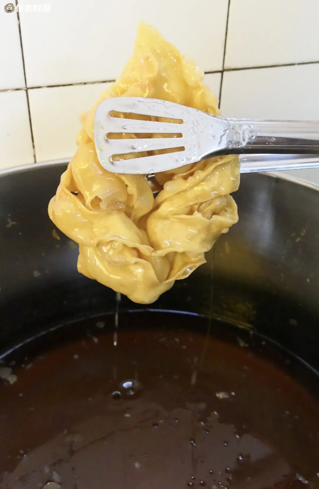 正宗的甜蛋散如今在市内茶楼之所以少见,是因为其制作工序繁复,费工又费时。除了和面有讲究,糖浆也需要经过特别熬制。由麦芽糖和白砂糖炼制成的糖浆,既不能太稀薄,也不能过于浓稠,火候尤为关键。它能为蛋散裹上一层甜蜜的“金衣”,让食客每一口都能感受到蛋散的香脆和甜蜜。