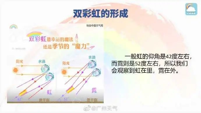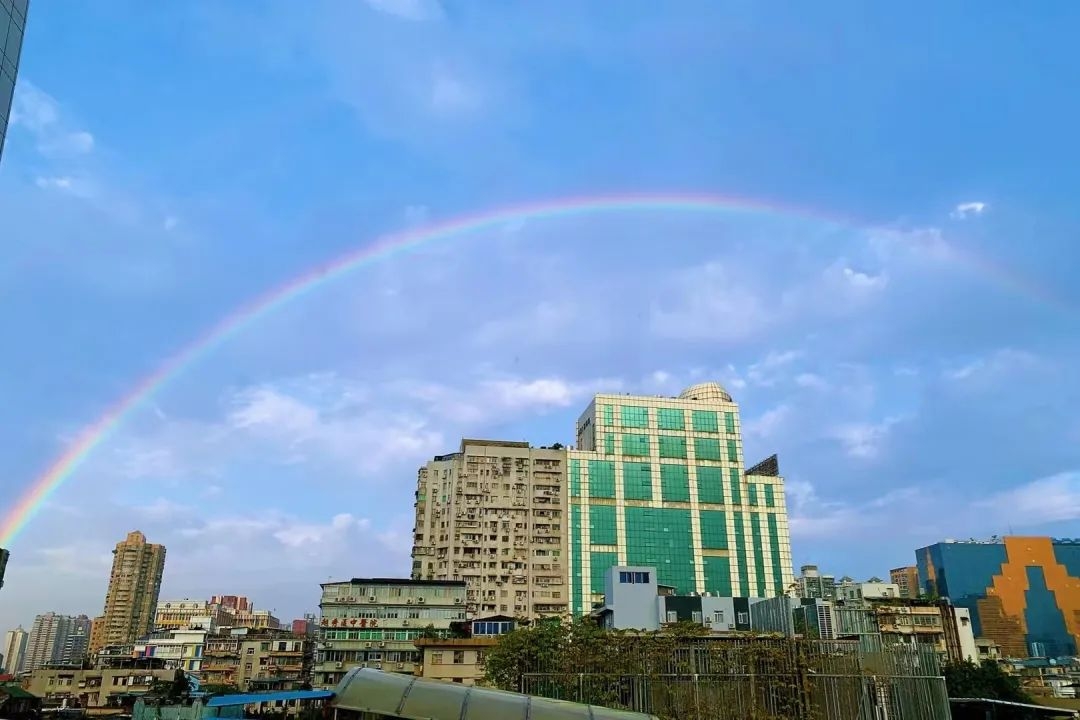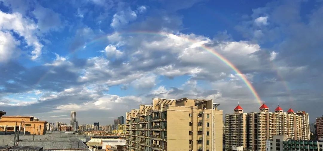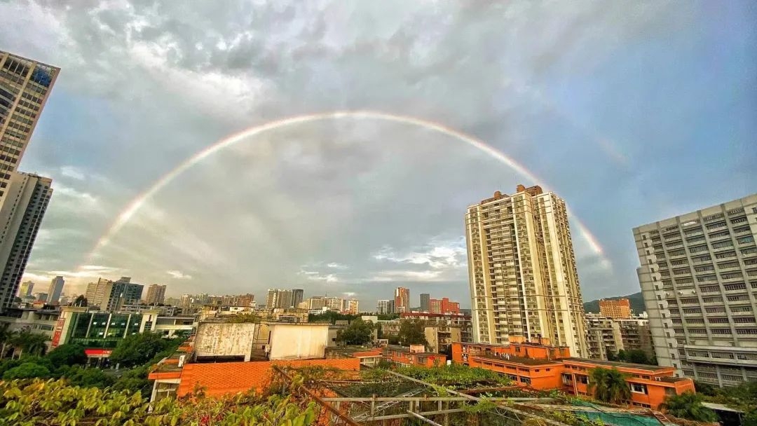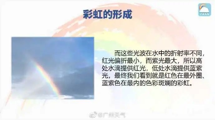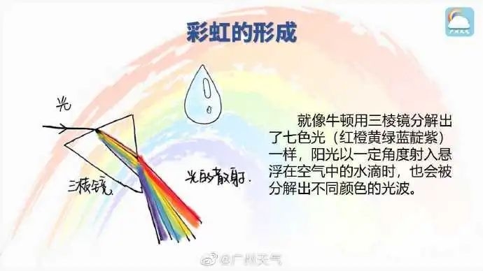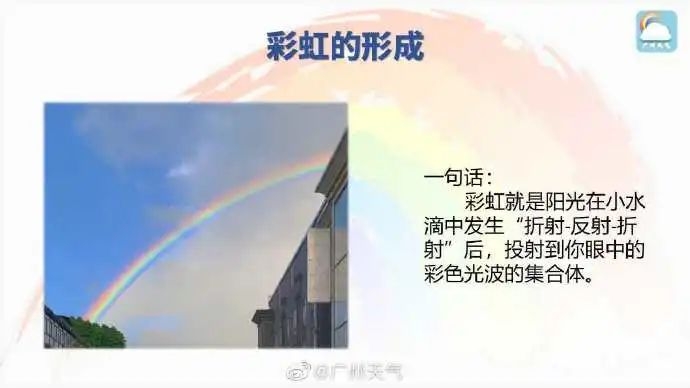 据@广州天气,大家都知道彩虹的形成需要太阳光在空气中的小水滴发生折射,今早的雨刚好为彩虹的出现提供了水汽条件,于是我们就幸运地见到彩虹啦