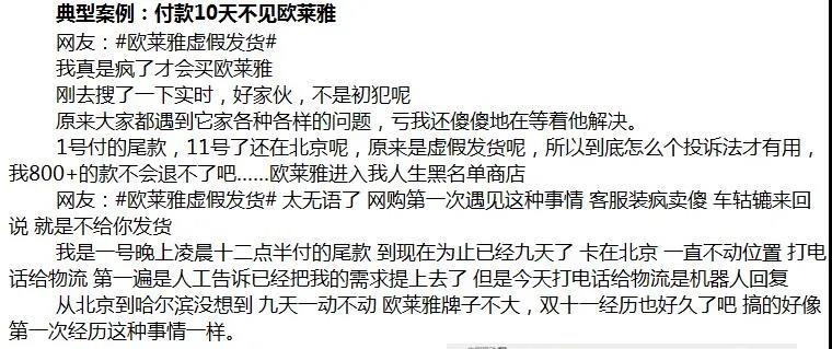 在典型案例方面,有网友称付款10天不见欧莱雅发货,“1号付的尾款,11号了还在北京,原来是虚假发货呢”。此外,薇诺娜也被指虚假发货。