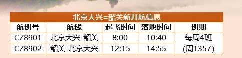 据南航在微信公众号公布的信息,北京大兴-韶关航线计划首航日期为2021年11月25日,因防疫政策等各种因素影响,具体开航时间以实际执行为准。预计该航线每周将有4班航班往返,计划逢周一、三、五、日开航,北京往返韶关区间的飞行时间约为2小时40分。该航线已经开放预约,预约后无法出行,定金可退。具体开航信息如下: