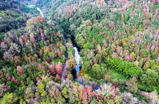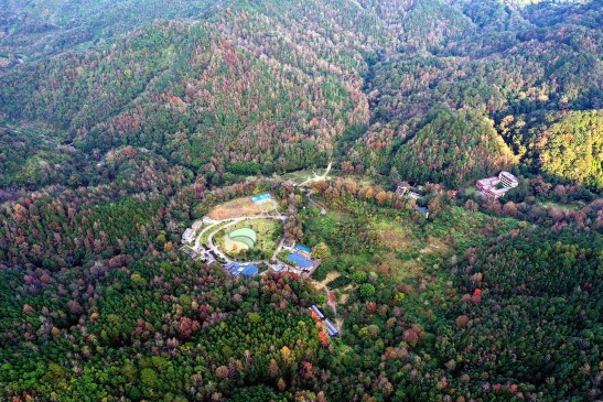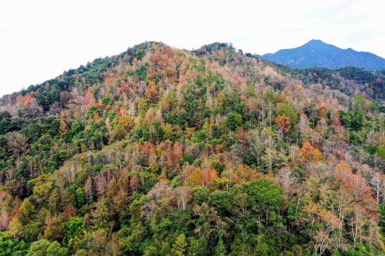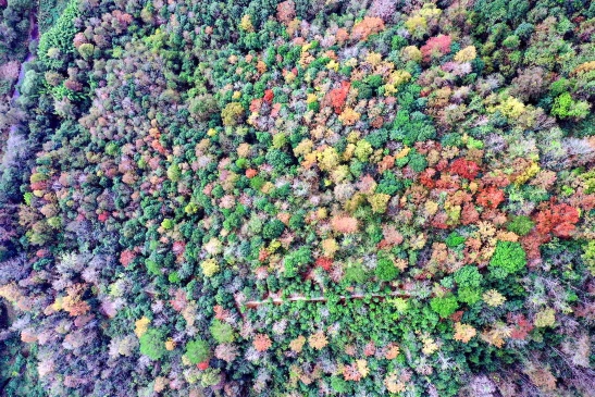 车八岭的初冬绚丽多彩,犹如一幅油画般,在无边无际的辽阔大山徐徐展开。静谧的森林被秋色浸染,镶嵌其中的河流湖泊和小溪让这里五彩缤纷,动静相宜。一条公路从五颜六色的森林中穿过,构成一幅美丽的图画。无人机镜头下,茂密的森林五颜六色,美不胜收。