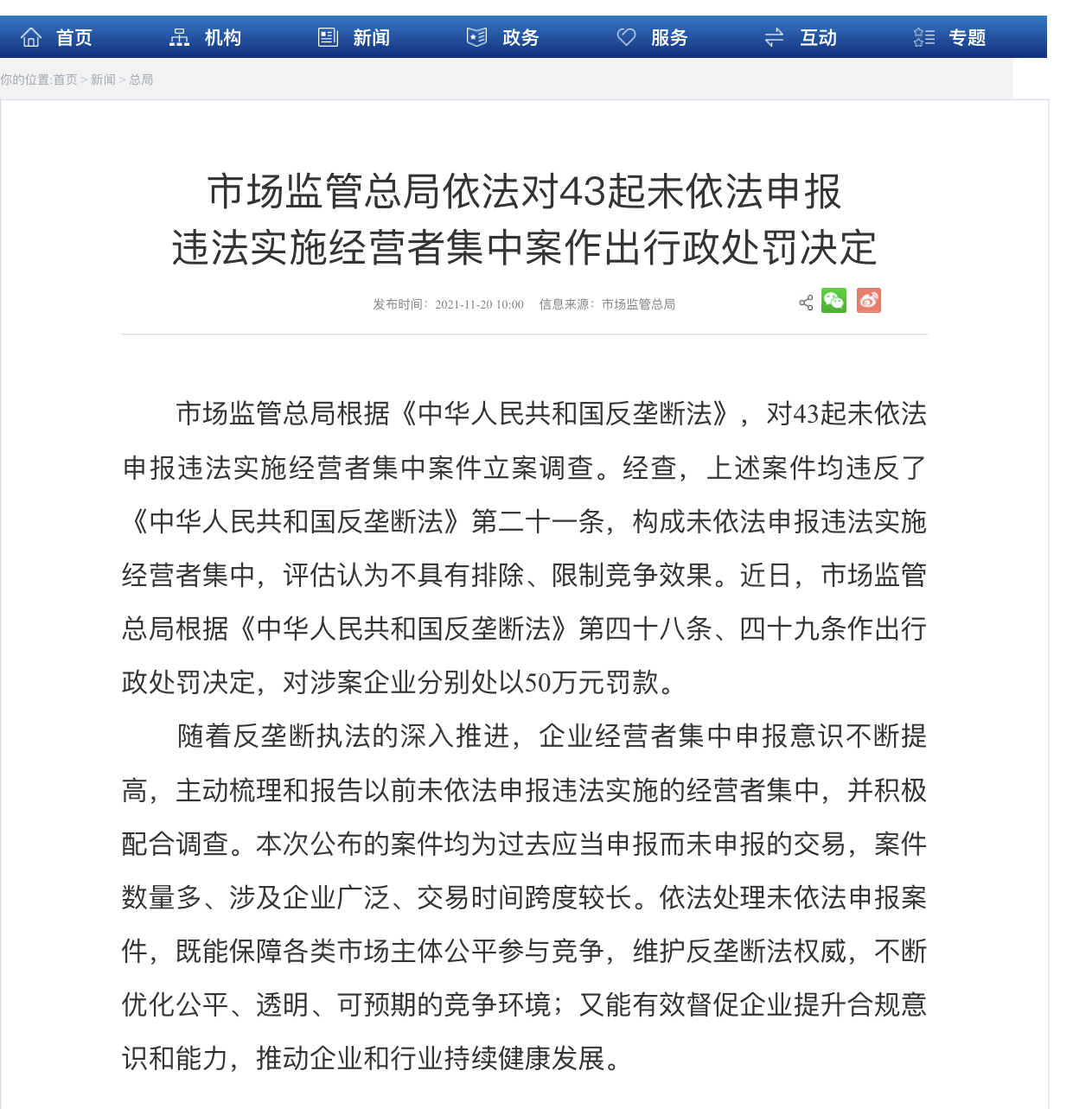 11月20日,据国家市场监管总局网站消息,市场监管总局根据《中华人民共和国反垄断法》,对43起未依法申报违法实施经营者集中案件立案调查。经查,上述案件均违反了《中华人民共和国反垄断法》第二十一条,构成未依法申报违法实施经营者集中,评估认为不具有排除、限制竞争效果。近日,市场监管总局根据《中华人民共和国反垄断法》第四十八条、四十九条作出行政处罚决定,对涉案企业分别处以50万元罚款。