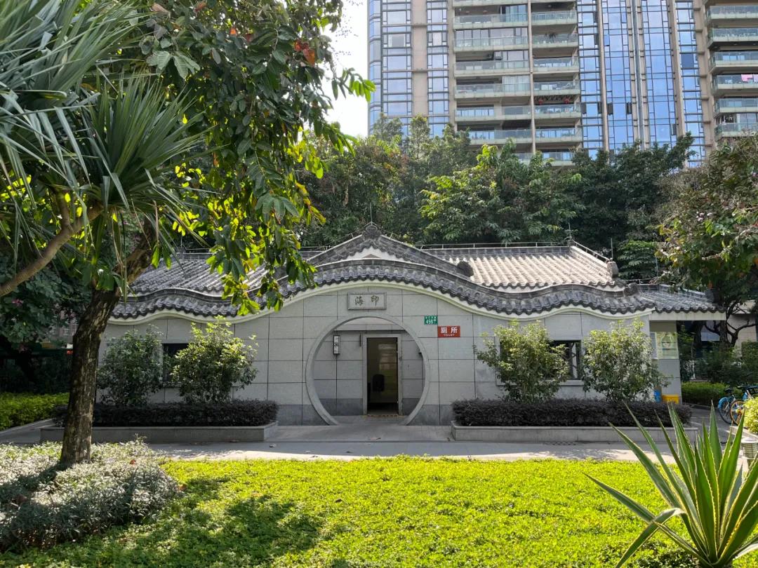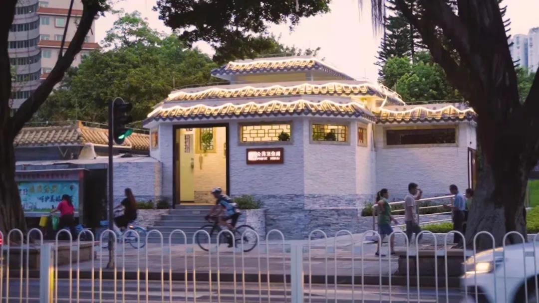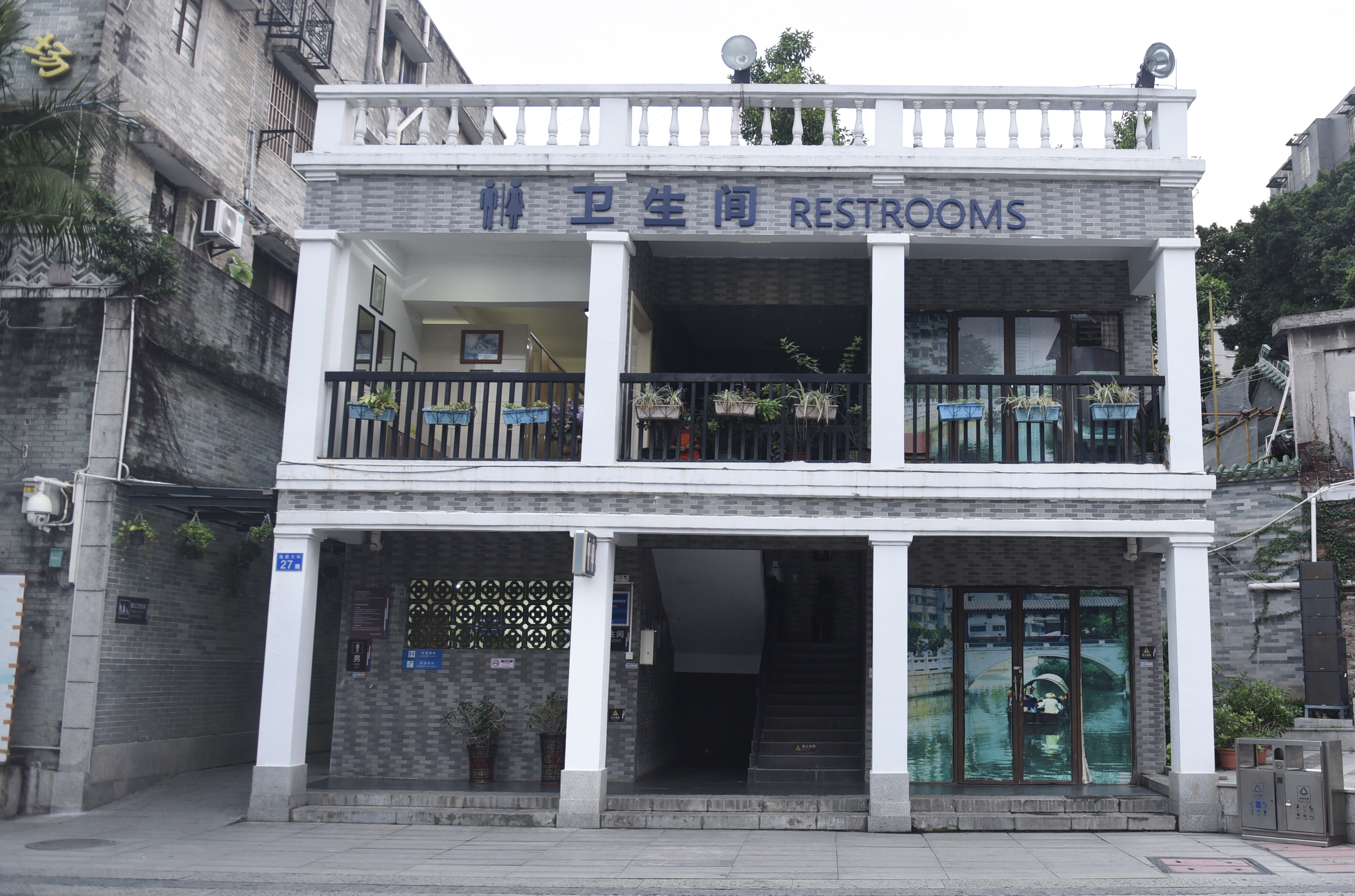 在滨江东路,从周周乐群众文化广场入口进入,走不到20米,就可以看见一座岭南风格建筑。浅灰色调的外墙与周边建筑十分协调,门口两边是花格窗,窗前种有绿植,中间是一个小型圆拱门,错落有致的檐坡瓦顶,初看还以为这里是个小旅游景点,仔细端详才发现是一座公厕。