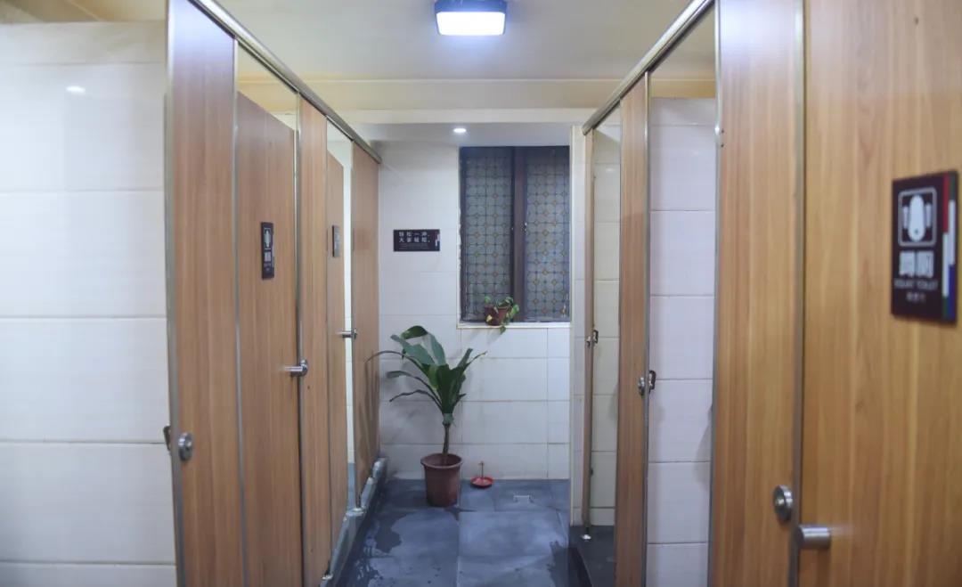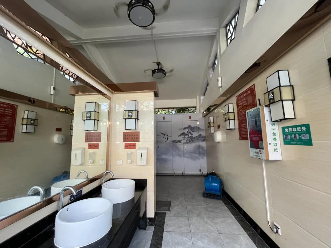 除了外观雅致,该公厕的设施完善和细节人性化也值得称赞。厕所的公共区域设置了智能显示屏,能够动态显示厕位的使用情况,同时实时显示了公厕内的温度、湿度、空气质量等信息。此外,在如厕区,每一个厕位外均设有一盏灯,红色代表有人在使用,绿色则代表无人使用。