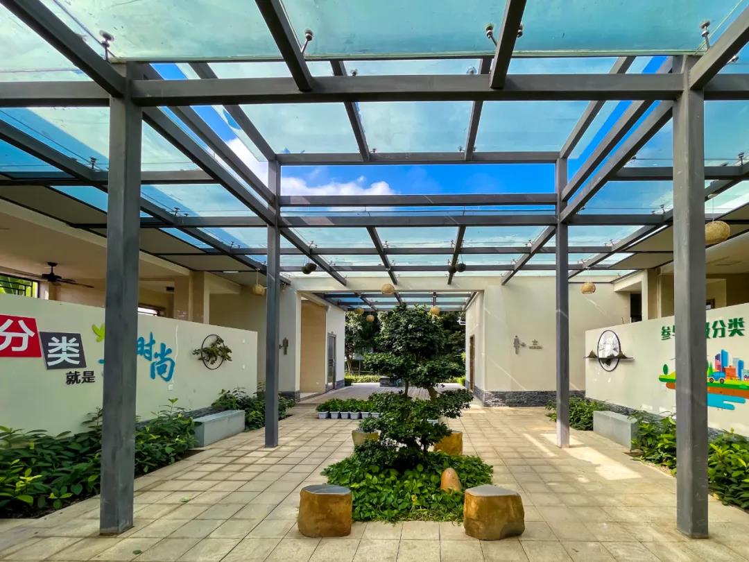 厕所内部多处使用了中式韵味的透气花格窗,极大增强了自然通风采光,整个如厕空间通透明亮,没有异味。除了满足大众如厕需求外,还增加了休憩、观赏的功能,公厕设有视野开阔的休闲观赏区,中庭摆放了休闲石凳、桌椅,生机盎然的鲜花绿植随处可见,醒目的垃圾分类新时尚宣传画映入眼帘,中国风装饰画点缀其中,给人一种舒适,悠然之感。