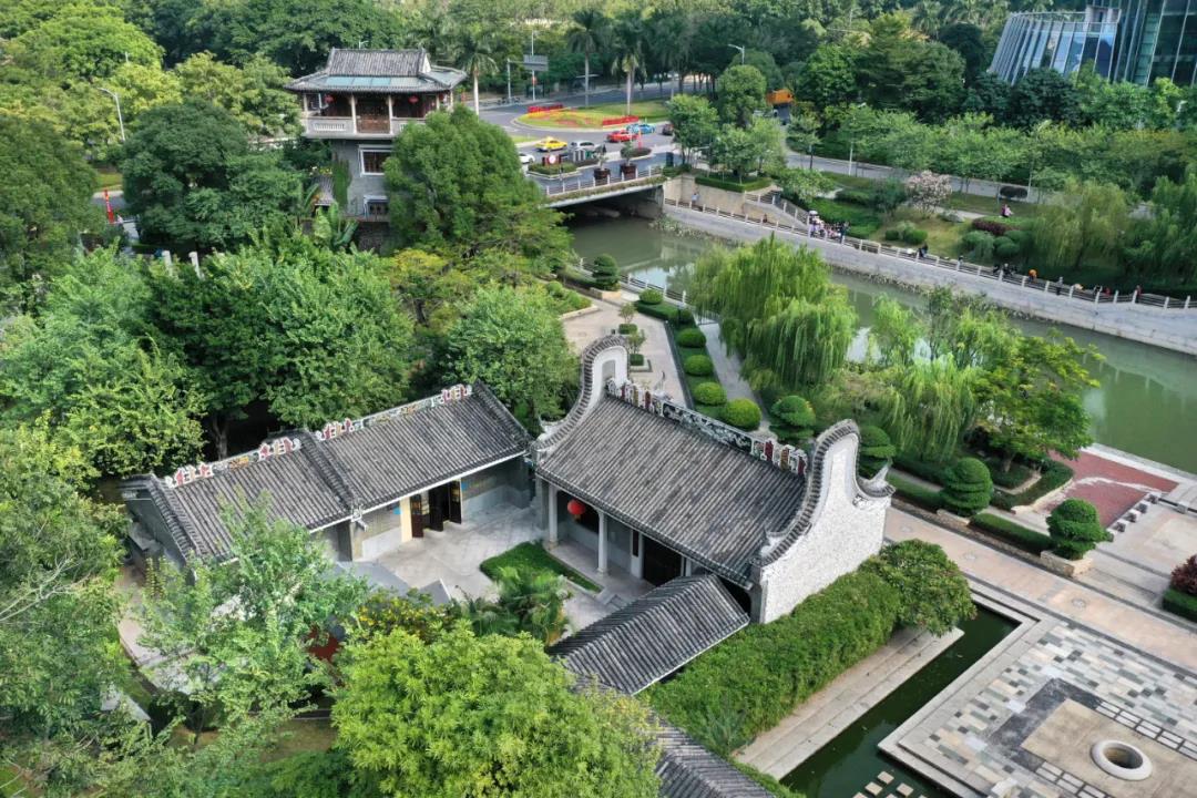 从空中俯瞰,四周为半坡斜屋面和玻璃天窗,错落有致、立体感强烈。曲径通幽,绿植葱茏,建筑与周围岭南园林有机结合,在建筑外观上打破了大众对原有公厕封闭狭窄的固有印象。