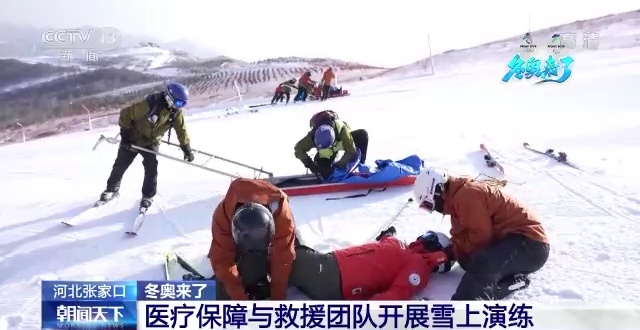 此次演练在张家口云顶滑雪场实景展开,模拟赛时出现运动员骨折受伤,由19名来自北京和河北的医生组成的测试赛医疗保障队迅速进场救治,随后同雪上救援队一起实施伤员转运处理。