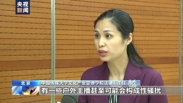 中国传媒大学文化产业管理学院法律系主任 郑宁:有一些户外主播甚至可能会构成性骚扰,比如说他对一些女性有一些身体上的触摸这种不尊重行为,这个在民法典里也是明令禁止的。