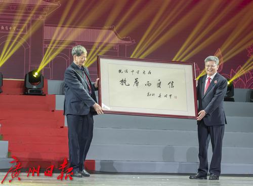 庆祝大会上,中国科学院院士吴硕贤向执信中学赠送书法作品