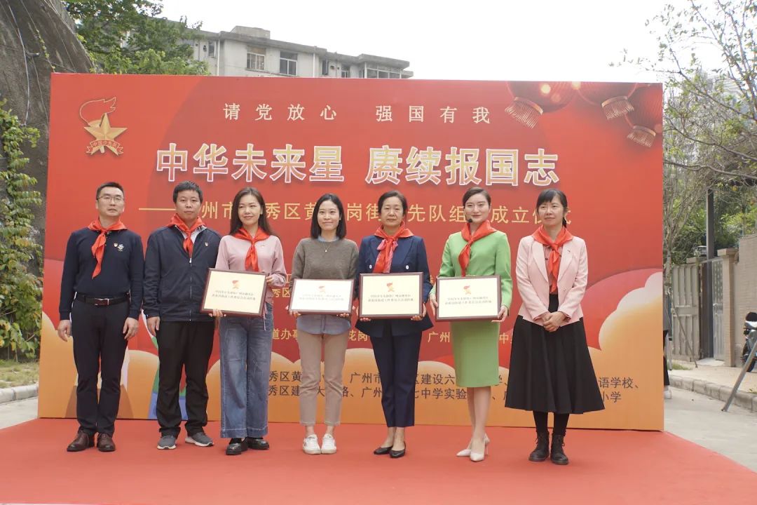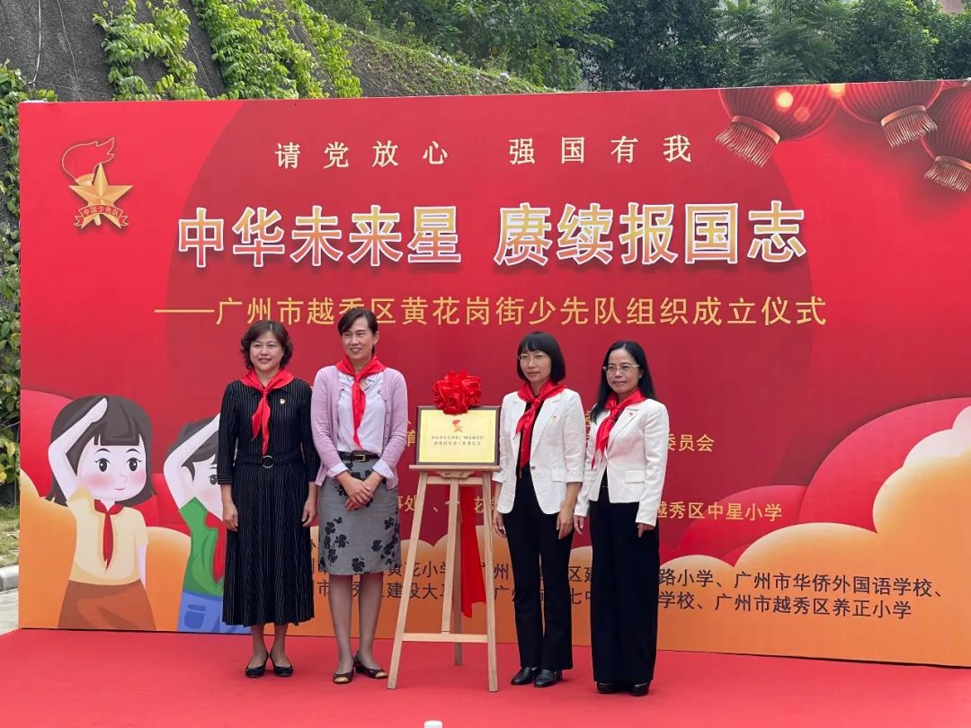 图说:广州市越秀区教育局副局长、越秀区少工委副主任陈晓,共青团广州市越秀区委员会副书记马利霞,黄花岗街党工委副书记刘丽萍,越秀区中星小学党支部书记、校长林伟贞一同进行了黄花岗街少工委揭牌仪式。