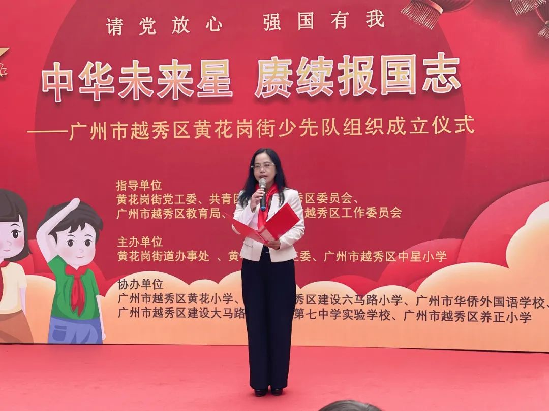 图说:据介绍,黄花岗街少工委主任分别由黄花岗街党工委副书记刘丽萍和越秀区第四学区学区长、中星小学党支部书记、校长林伟贞同时担任;黄花岗街道办事处副主任刘洁、黄花岗街党建办主任朱争华、黄花小学校长邝家明、黄花小学党支部书记潘俊青、养正小学党支部书记夏泽权、越秀区第四学区助理许贺麟为黄花岗街少工委常务副主任。活动上,黄花岗街少工委主任、常务副主任、副主任、成人委员、学生委员分别获得了聘书。