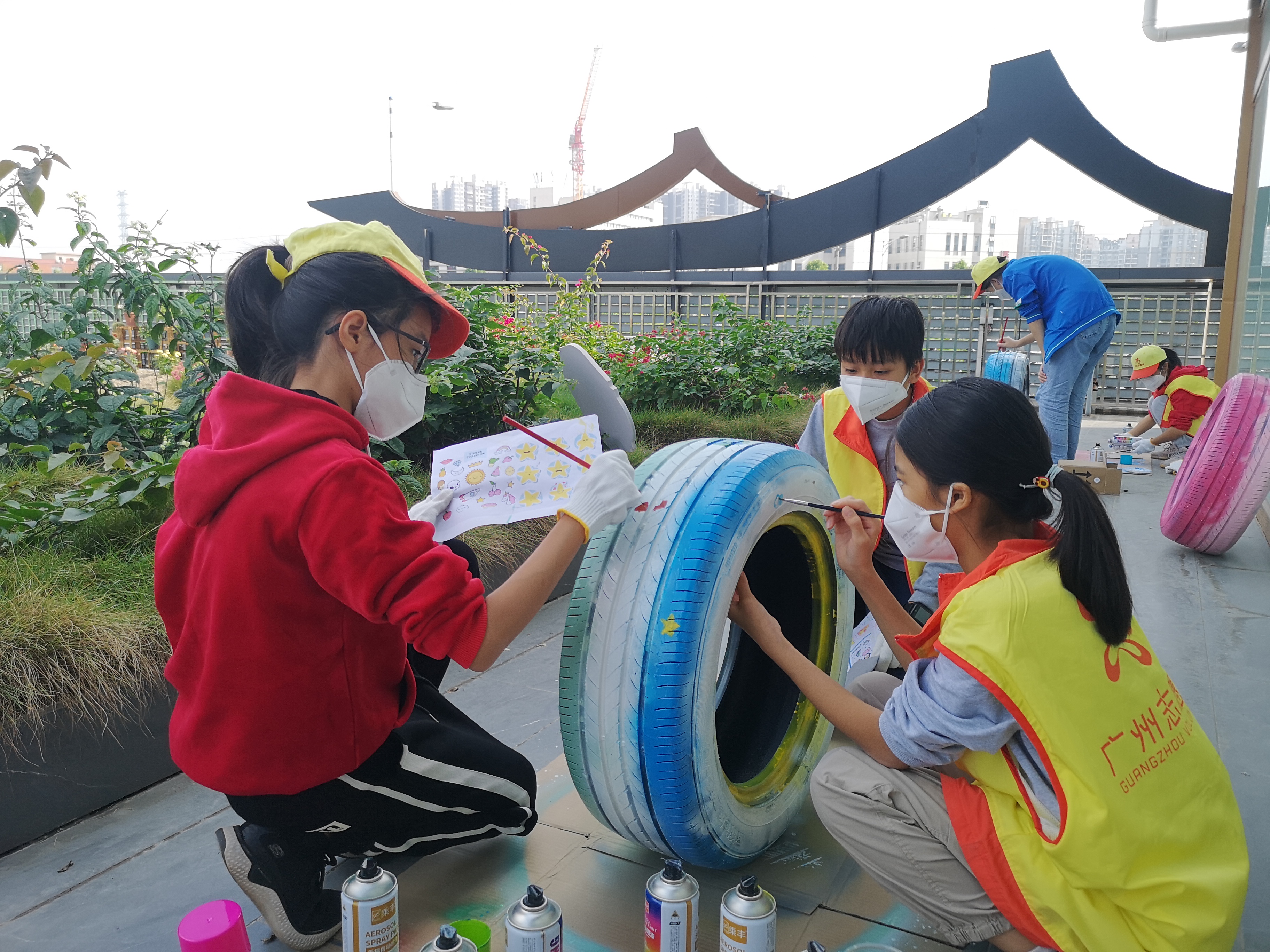 志愿者带领大家使用喷漆、画笔、丙烯颜料,将11条废旧轮胎进行绘画创作。大家热情投入,发挥想象力和创造力,撸起袖子给轮胎点“颜色瞧瞧”。