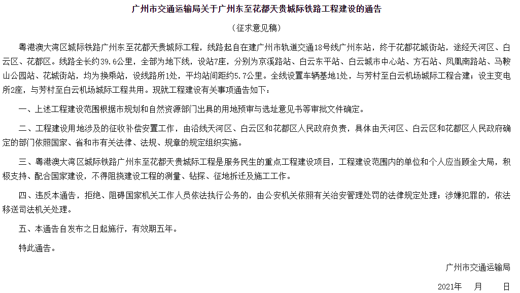 记者11月21日获悉,为贯彻落实《粤港澳大湾区城际铁路建设规划》要求,加快广州东至花都天贵城际、芳村至白云机场城际铁路工程项目建设进程,尽快开展征地拆迁等前期工作,广州市交通运输局起草《广州市交通运输局关于广州东至花都天贵城际铁路工程建设通告》和《广州市交通运输局关于芳村至白云机场城际铁路工程建设通告》,公开征求社会公众意见。意见征集的截止时间为11月30日。