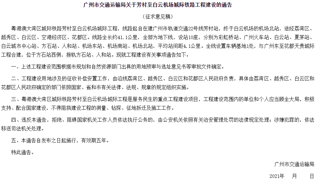 广州市交通运输局关于芳村至白云机场城际铁路工程建设的通告。通讯员供图