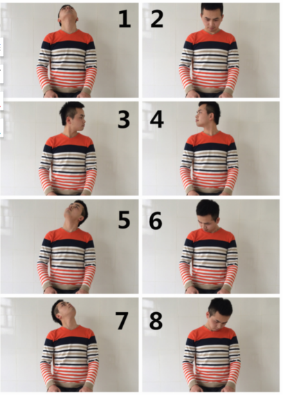 慢慢左后侧仰头部至最大角度,维持6秒,复原。