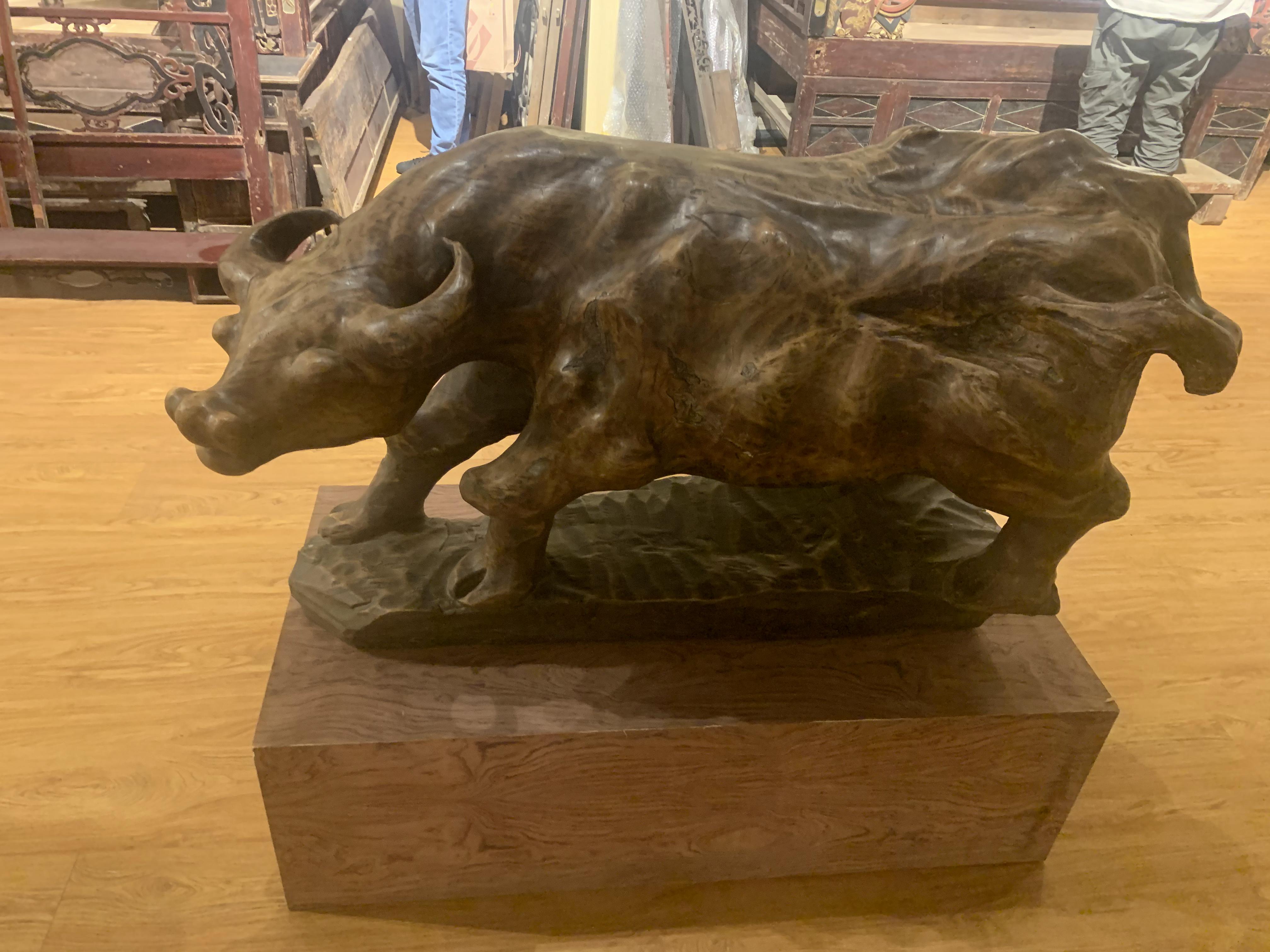 刘艳平收藏的齐白石木雕作品,大致可以分为竹木雕和木雕两大类。在刘艳平的齐白石木雕藏品中,《神牛》是她最珍爱的一件。这件长达一米多、用老树桩稍作雕琢而成的作品是白石木雕作品中别开生面的一件,原先保存于白石老人长孙齐楚珠家中。