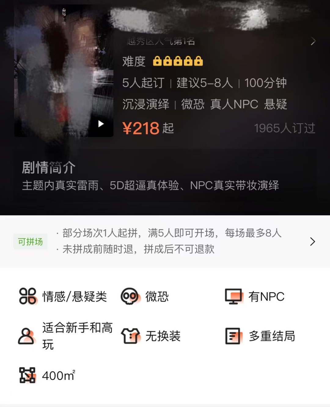 11月20日中午,记者走进北京路商圈一栋大楼。根据该大楼一楼的指示牌显示,在该大楼中一共入驻了7家密室逃脱、2家剧本杀门店。记者随意走进其中一家主打“恐怖密室”的体验馆,时值周末,店内陆陆续续有消费者前来,据店家介绍,直至下午6时前,店内已是满订状态。同一时间段,该大楼里其他主打恐怖主题的密室同样人员爆满,这些密室游戏通常在预定网页上会提示恐怖程度“中恐/微恐/非恐”“有/无NPC”等关键信息,不过记者留意到,尽管部分商家有提示“不适合12岁以下参与”,但仍旧有一些商家并未在游戏中备注消费者的适用年龄。记者以消费者的身份,任意选中了一款主打精神病医院主题的恐怖密室游戏。在该款恐怖密室游戏的购买页面上,商家对其定义为“微恐”,然而记者作为新手首次进入恐怖密室后,却被其强烈的沉浸感几度“劝退”。