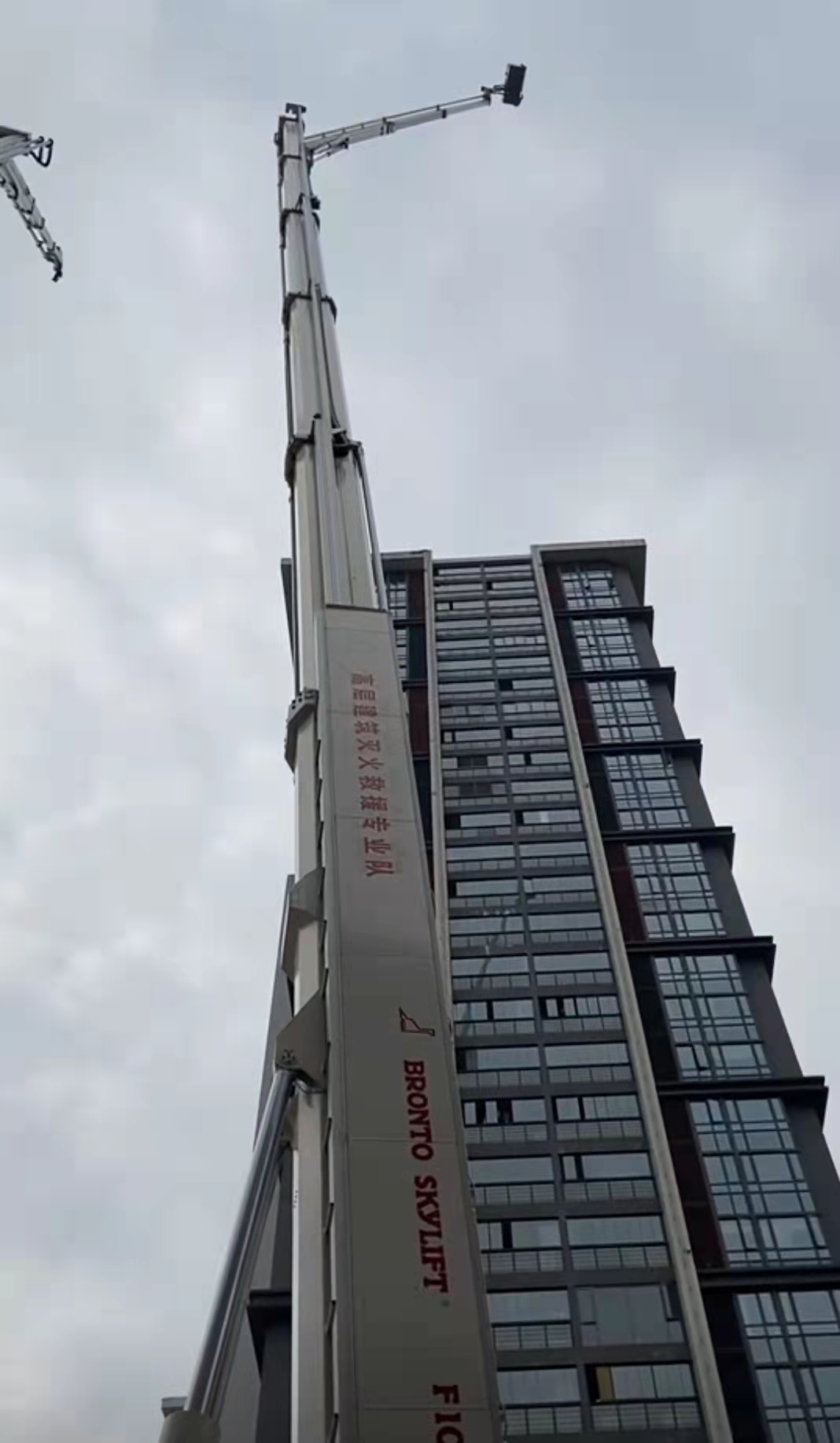 登高车通过曲臂将平台伸到99米高空去,人站在上面可以摸到101米的位置。通讯员供图