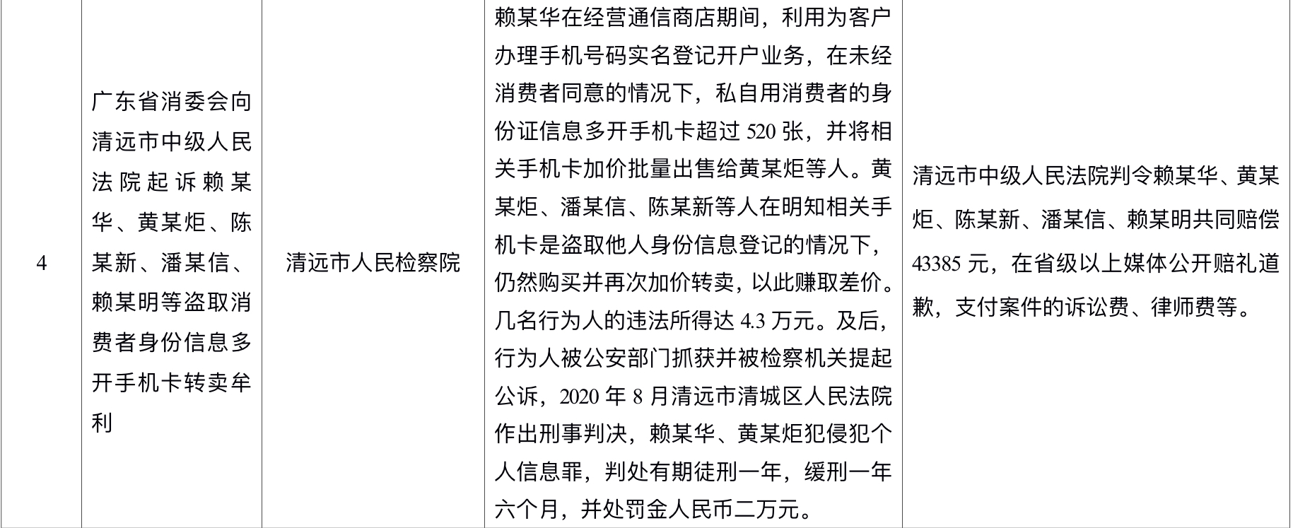 “广东省消委会向清远市中级人民法院起诉赖某华、黄某炬、陈某新、潘某信、赖某明等盗取消费者信息多开手机卡专卖牟利”案: