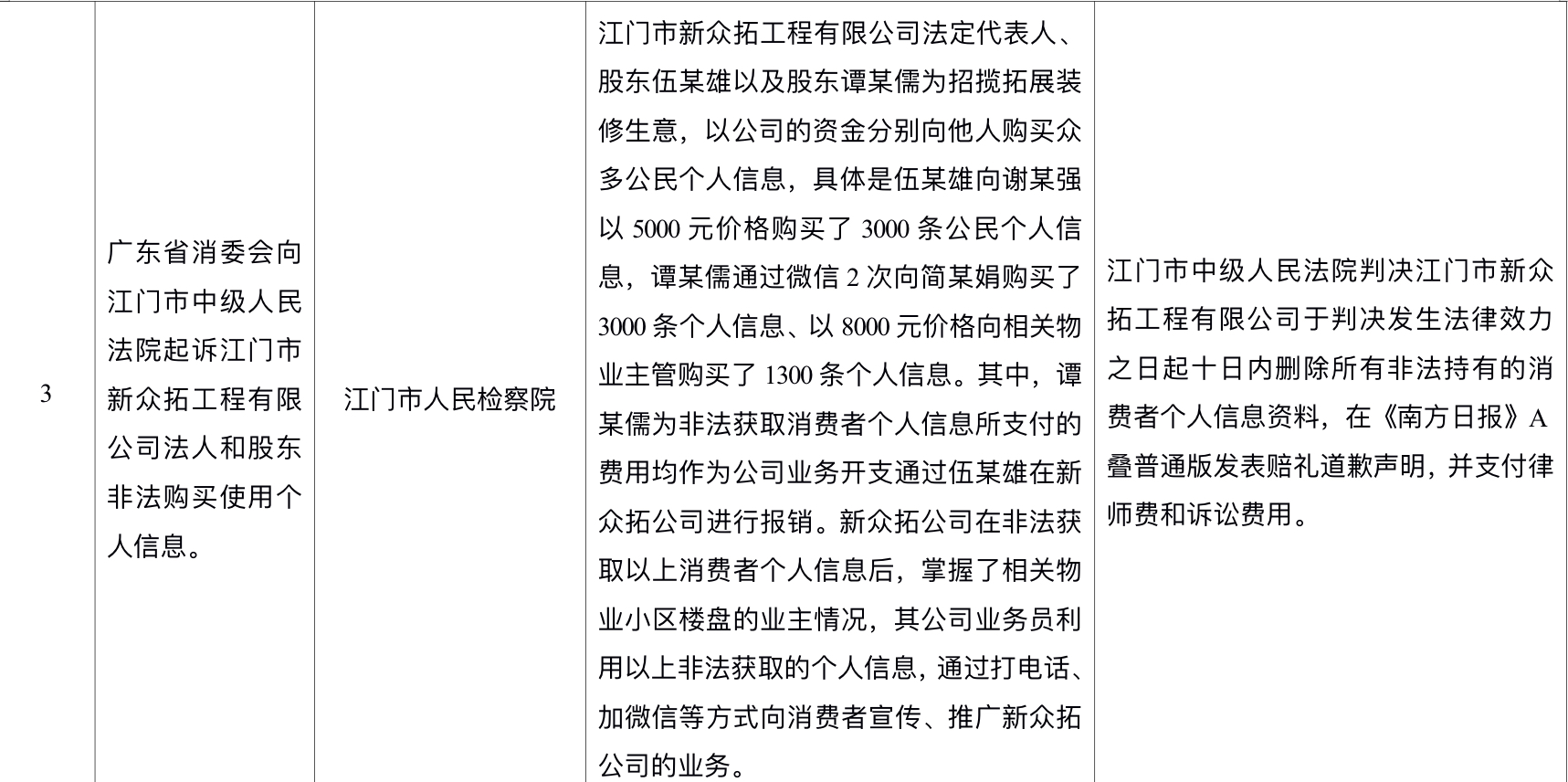 “广东省消委会向江门市中级人民法院起诉江门市新众拓工程有限公司法人和股东非法购买使用个人信息”案: