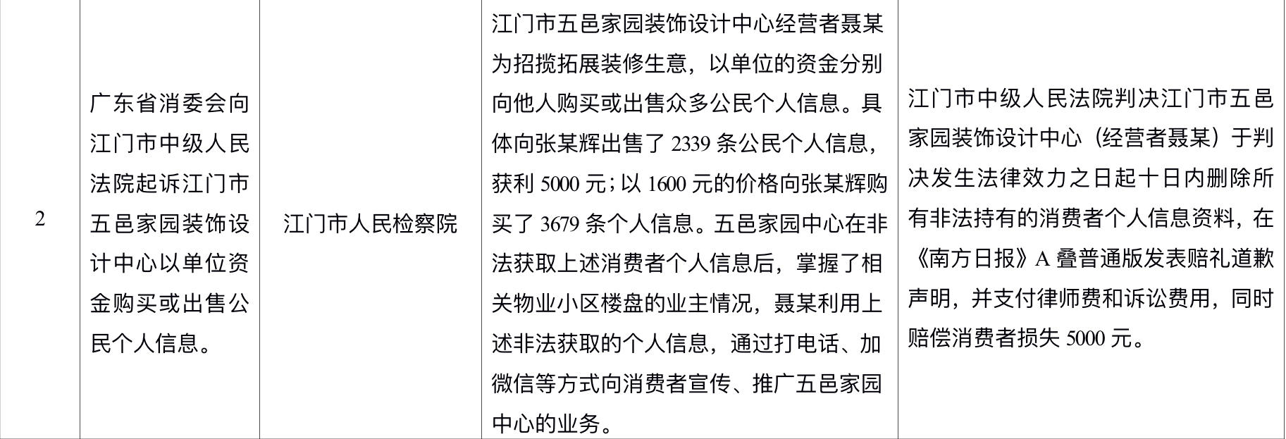 “广东省消委会向江门市中级人民法院起诉江门市五邑家园装饰设计中心以单位资金购买或出售公民个人信息”案、
