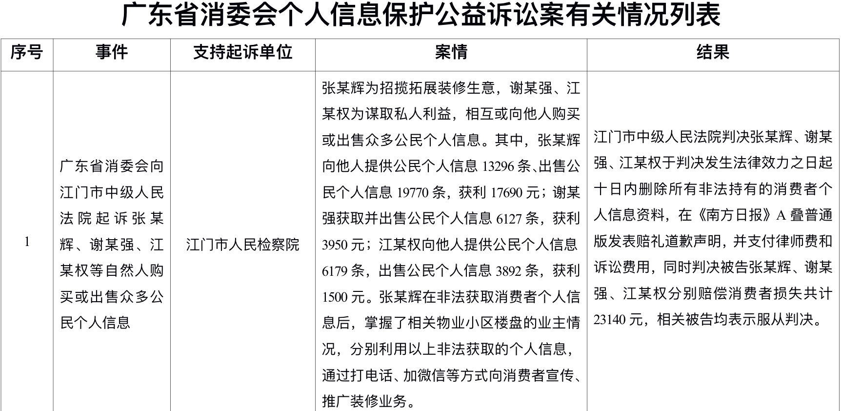 广东省消委会副秘书长黄冠英介绍,今年3月15日,广东省消委会在江门市人民检察院、江门市蓬江区检察院的支持下,就张某辉等五被告在经营活动中违法收集、买卖消费者个人信息的行为,代表消费者分别提起三宗消费民事公益诉讼;7月27日,江门市中级人民法院对三宗案件进行公开宣判,判决相关被告人删除所有非法持有的个人信息,公开发表赔礼道歉声明,并支付律师费和诉讼费用,同时判决其中四被告分别赔偿消费者损失共计28140元。今年5月21日,在清远市人民检察院的支持下,广东省消委会就赖某华等五被告非法盗用个人信息谋利、侵犯消费者个人隐私的行为,再度提起一宗消费民事公益诉讼;10月27日,清远市中级人民法院作出判决,判令五名被告人共同赔偿43385元,在省级以上媒体公开赔礼道歉,并支付案件的诉讼费、律师费。