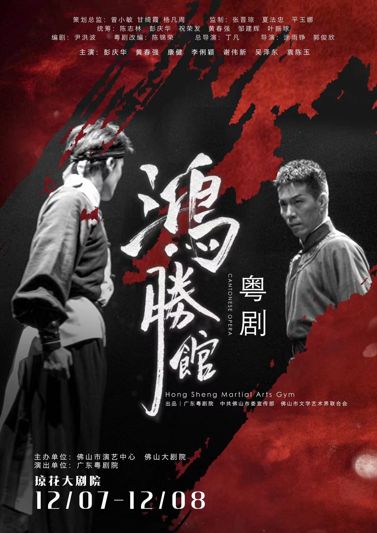 12月7日、8日,由广东粤剧院和佛山市委宣传部、佛山市文联联合打造的红色功夫粤剧《鸿胜馆》即将在佛山琼花大剧院上演。该剧由广东粤剧院演出,国家一级演员、中国戏剧梅花奖获得者彭庆华领衔,黄春强、康健、李俐颖、谢伟新等名家新秀联合主演。