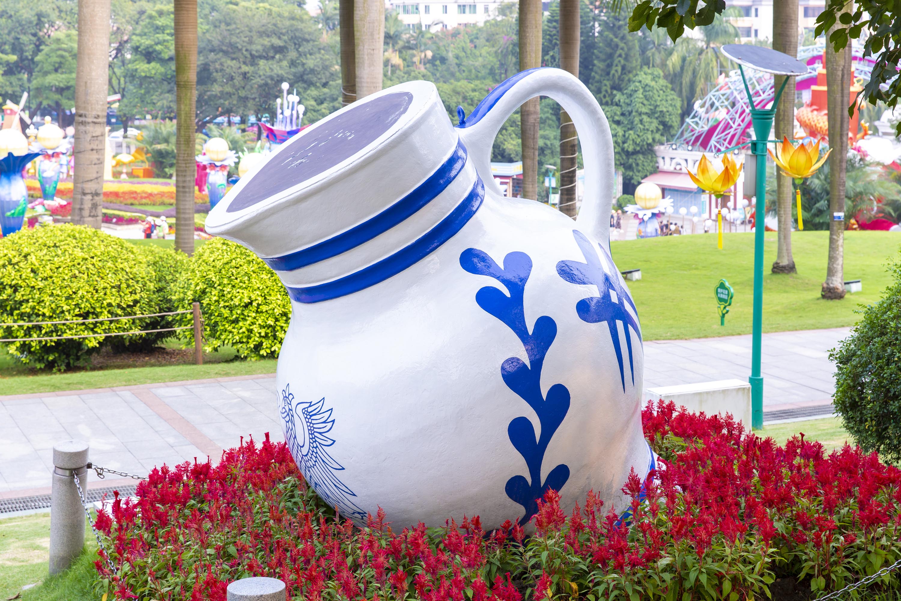 在云台花园谊园,有一只巨大的白底描蓝花瓶子,它是1995年德国法兰克福市在与广州缔结友好城市7年后,特别用玻璃钢制作的特大号“苹果酒瓶模型”——搬钵。这个高达两米的大酒壶呈60度的倾斜状,像是在白云山脚下倾倒着美酒和友谊。