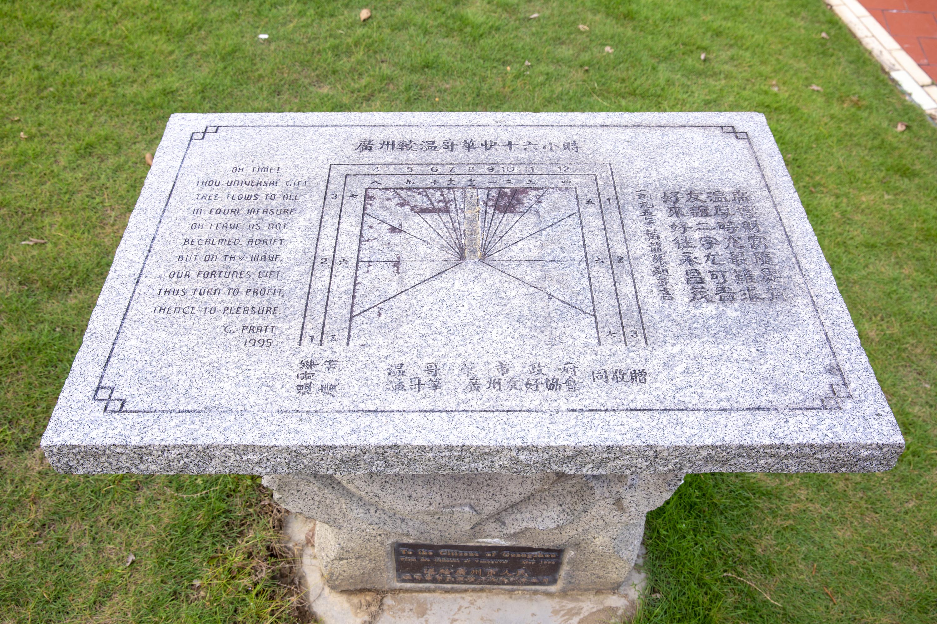 1996年5月,加拿大温哥华赠送给广州一个石制日晷,以纪念两座城市结好10周年。日晷有里外两圈表盘,分别代表温哥华和广州的时间。作品底座是象征温哥华的动物形象——三文鱼,并雕有“温哥华市民赠送给广州市民的日晷”的中英文字样。