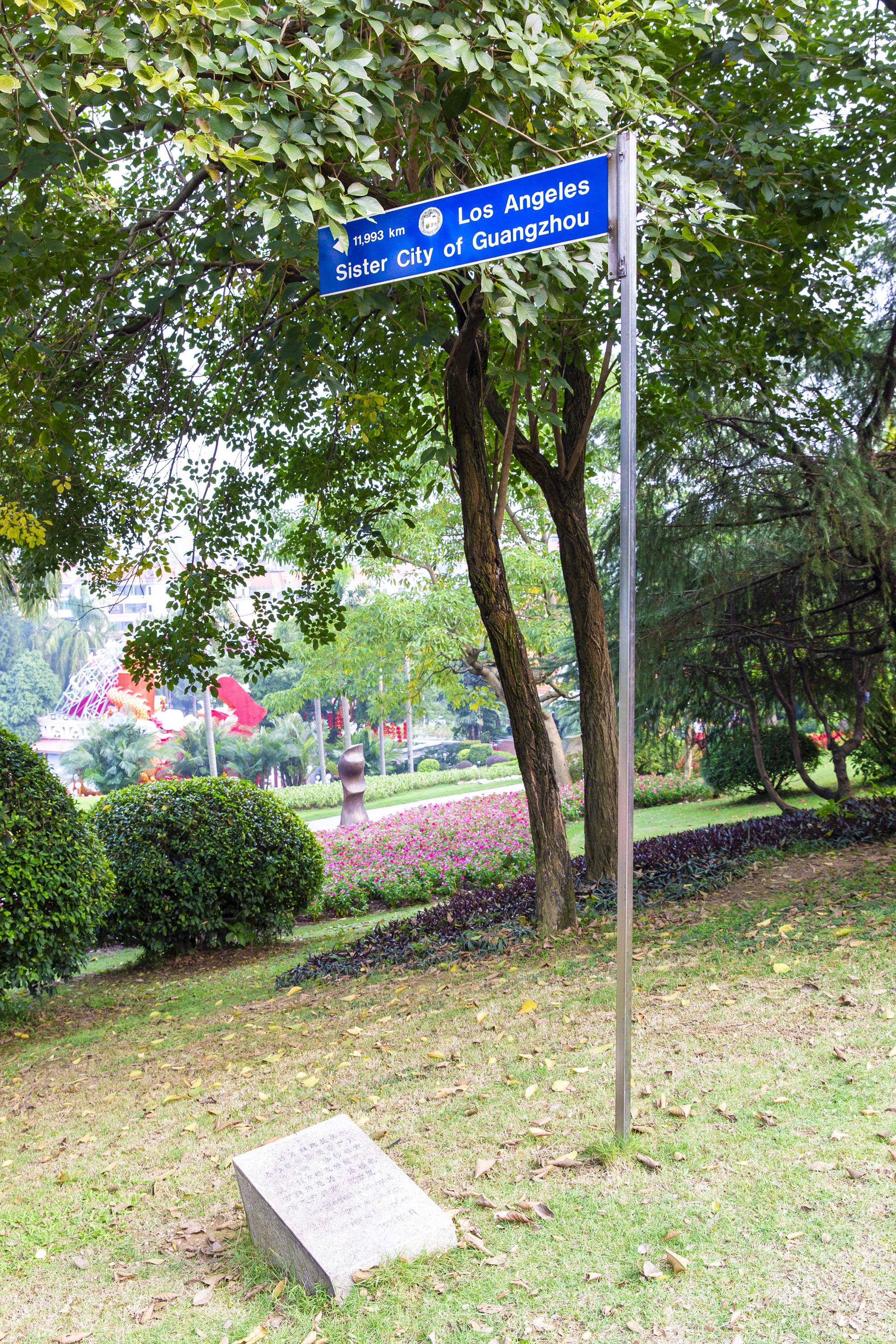 “前方,11993公里!”1998年3月,洛杉矶给广州赠送了一座路向牌,指明洛杉矶在何方。这座高约4米的路牌便竖立在谊园的小山坡上,指向洛杉矶市所在方位,路牌上写着:“LosAngeles,11993km. Sistercity of Guangzhou.”意为:“广州的姐妹城市洛杉矶距广州11993公里。“