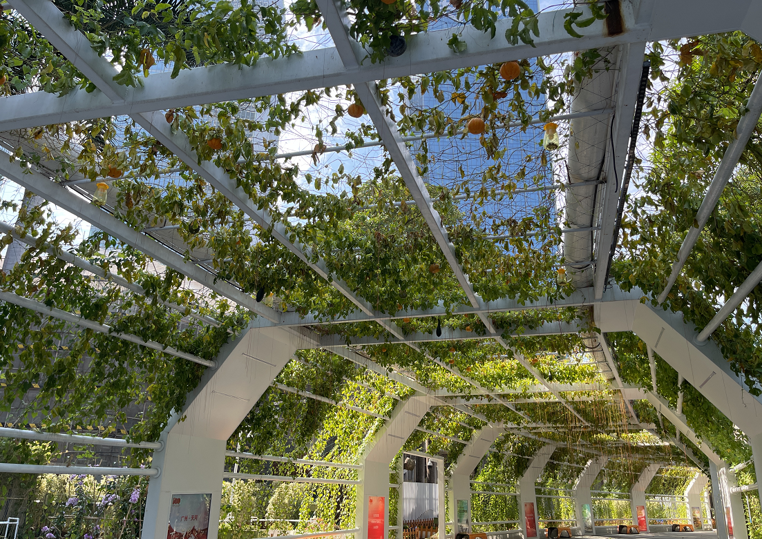 来到农园秘境,记者看到巨型的太空南瓜、仙人掌科植物。有意思的是,这里还有一条以都市创意市集文化为主导的瓜果长廊,绿色的藤蔓绕成天然的绿荫走廊,上面还挂着鳄鱼南瓜等,让人爱不释手。穿过长廊,来到以四季百果为主题的百果园,里面有大众熟悉的火龙果、百香果、无花果、大樱桃、咖啡豆等,也有比较少见的嘉宝果、巧克力布丁果、蜡烛果、手指柠檬等,甚至还有小片的红皮香蕉林。